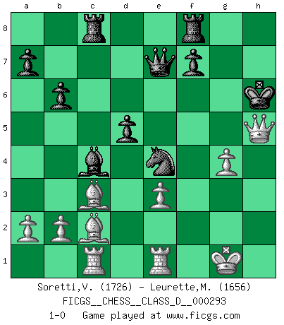 Last move : 1-0 2023 March 28 13:45:47 [Event "FICGS__CHESS__CLASS_D__000293"] [Site "FICGS"] [Date "2023.03.14"] [Round "1"] [White "Soretti,Vincenzo"] [Black "Leurette,Marc-Antoine"] [Result "1-0"] [WhiteElo "1726"] [BlackElo "1656"] 1.d4 d5 2.Nf3 e6 3.c4 Nf6 4.Nc3 Be7 5.e3 b6 6.cxd5 exd5 7.Bd3 Bb7 8.O-O O-O 9.Bd2 Nbd7 10.Rc1 c5 11.dxc5 Nxc5 12.Bc2 Nce4 13.Be1 Rc8 14.Nd4 Nxc3 15.Bxc3 Ba6 16.Re1 g6 17.Ba4 Bc4 18.Nc6 Qc7 19.Nxe7+ Qxe7 20.Qd4 Kg7 21.g4 g5 22.f4 h6 23.fxg5 hxg5 24.h4 Kg6 25.hxg5 Kxg5 26.Qf4+ Kg6 27.Bc2+ Ne4 28.Qf5+ Kh6 29.Qh5+ 1-0 Follow this game move after move (download)Chess is imagination. (David Bronstein) Lisa Lane, amerikanische Schachmeisterin, hatte Fischer einmal als stärksten lebenden Spieler bezeichnet. Antwort: Das ist richtig, aber Lisa Lane ist eigentlich nicht in der Lage, das zu beurteilen. (Robert James Fischer) El Ajedrez es un terrible juego. Si no controlas el centro, tu oponente tiene una posición mas holgada. Si tienes control del centro, ¡entonces realmente tu tienes algo de que preocuparte!. (Siegbert Tarrasch) Aidez vos pièces, elles vous aideront. (Paul Morphy) It's not the will to win, but the will to prepare to win that makes the difference. (Bear Bryant)
