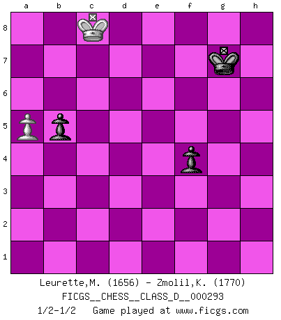 Last move : 1/2-1/2 2023 March 31 19:10:58 [Event "FICGS__CHESS__CLASS_D__000293"] [Site "FICGS"] [Date "2023.03.14"] [Round "1"] [White "Leurette,Marc-Antoine"] [Black "Zmolil,Karel"] [Result "1/2-1/2"] [WhiteElo "1656"] [BlackElo "1770"] 1.e4 e5 2.Nf3 Nc6 3.Bc4 h6 4.c3 Nf6 5.d3 Be7 6.Be3 Ng4 7.O-O d6 8.Re1 O-O 9.h3 Nxe3 10.Rxe3 Bf6 11.Nbd2 Ne7 12.Nh2 Ng6 13.Ndf3 Nf4 14.d4 Qe7 15.a4 Kh7 16.dxe5 dxe5 17.Bf1 g5 18.Re1 Be6 19.g4 Rad8 20.Qc2 Rd7 21.b4 Rfd8 22.Red1 Rxd1 23.Rxd1 Rxd1 24.Qxd1 Qd7 25.Qxd7 Bxd7 26.a5 a6 27.c4 c6 28.c5 Ne6 29.Bc4 Kg7 30.Nf1 Kg6 31.Ne3 Nd8 32.Nf5 Be6 33.Bd3 Bh8 34.Nd2 f6 35.f3 h5 36.gxh5+ Kxh5 37.Nc4 Kg6 38.Kg2 Bg7 39.Kg3 Bf8 40.h4 gxh4+ 41.Nxh4+ Kg5 42.Nf5 Kh5 43.Be2 Kg5 44.Nce3 Nf7 45.Bc4 Bxc4 46.Nxc4 Kh5 47.Ncd6 Nd8 48.f4 Kg6 49.Kg4 exf4 50.Kxf4 Bh6+ 51.Nxh6 Kxh6 52.Kf5 Kg7 53.Nxb7 Nxb7 54.Ke6 Nd8+ 55.Kd7 Nf7 56.Kxc6 Ng5 57.Kb6 Nxe4 58.c6 f5 59.c7 Nd6 60.Kc6 Nc8 61.Kd7 Na7 62.c8Q Nxc8 63.Kxc8 f4 64.b5 axb5 1/2-1/2 Follow this game move after move (download)The older I grow, the more I value Pawns. (Keres) Ich brauche nur einen Blick auf das Schachbrett zu werfen, und weiß schon, was in der Stellung steckt, was geschehen kann und was geschehen wird. Alle übrigen suchen und prüfen, ich aber weiß es! (José Raúl Capablanca) El jugador de combinación piensa hacia adelante; comienza de la posición dada y trabaja las movidas contundentes en su mente. (Emanuel Lasker) Le jeu d'échecs est comme rejeté hors du temps. (Antoine de Saint-Exupéry) All war is based on deception. (Sun Tzu)
