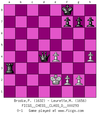 Last move : 0-1 2023 June 11 19:32:14 [Event "FICGS__CHESS__CLASS_D__000293"] [Site "FICGS"] [Date "2023.03.14"] [Round "1"] [White "Brodie,Peter"] [Black "Leurette,Marc-Antoine"] [Result "0-1"] [WhiteElo "1632"] [BlackElo "1656"] 1.d4 d5 2.Nf3 Nc6 3.e3 Nf6 4.Bb5 Bd7 5.O-O a6 6.Ba4 b5 7.Bb3 e6 8.Nc3 Bd6 9.a3 b4 10.axb4 Nxb4 11.Bd2 O-O 12.Qe2 Bb5 13.Nxb5 a5 14.c3 Nc6 15.c4 Bb4 16.Bxb4 Nxb4 17.cxd5 exd5 18.Nc3 c6 19.Ne5 Qc7 20.Ba4 Nd7 21.Bxc6 Nxe5 22.Bxd5 Nxd5 23.Nxd5 Qc4 24.Qxc4 Nxc4 25.b3 Nd2 26.Rfd1 Nxb3 27.Rab1 Rfb8 28.Rxb3 Rxb3 29.h4 a4 30.Ra1 a3 31.Kf1 a2 32.Ne7+ Kf8 33.Nc6 Rb1+ 34.Rxb1 axb1Q+ 35.Ke2 Qc2+ 36.Kf3 Qxc6+ 37.e4 Qf6+ 38.Ke3 Ra3+ 39.Ke2 Qxd4 0-1 Follow this game move after move (download)I give 98 percent of my mental energy to Chess. Others give only 2 percent. (Bobby Fischer) Wenn sie aufgeben, dann danke ich Ihnen für das Spiel (Eventualzug beim Fernschach). (Anonymous) La pasion por jugar al Ajedrez es una de las mas inexplicables en el mundo. (H.G. Wells) Les erreurs sont comme les malheurs, elles n'arrivent jamais seules. (Siegbert Tarrasch) Computers have lots of memory but no imagination. (Anonymous)