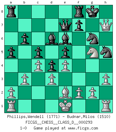 Last move : 1-0 2023 March 18 18:4:15 [Event "FICGS__CHESS__CLASS_D__000293"] [Site "FICGS"] [Date "2023.03.14"] [Round "1"] [White "Phillips,Wendell"] [Black "Budnar,Milos"] [Result "1-0"] [WhiteElo "1771"] [BlackElo "1510"] 1.d3 d5 2.Nd2 e5 3.e4 Nf6 4.Be2 c5 5.c3 Nc6 6.h3 a6 7.Qc2 d4 8.Nf1 h6 9.Ng3 Bd6 10.Bd2 O-O 11.Nf3 Ne7 12.c4 b6 13.Qc1 a5 14.b3 Be6 15.Bxh6 gxh6 16.Qxh6 Ng6 17.Ng5 Qe7 18.Nh5 Nxh5 19.Qh7+ 1-0 Follow this game move after move (download)I love all positions. Give me a difficult positional game, I will play it. But totally won positions, I cannot stand them. (Hein Donner) Fischer ist das größte Genie, das je vom Schachhimmel heruntergestiegen ist. (Mikhail Nekhemyevich Tal) El Ajedrez expande y enriquece tu mente. (Saudin Robovic) Les écrivains ont utilisé les échecs pour analyser les côtés extrêmes de la nature humaine. Dans ce cadre, les échecs offrent un champ d'expérimentation idéal. Mais on pourrait faire la même chose avec la peinture. Et là, en vous référant à Van Gogh, vous ne tirerez pas de conclusion définitive sur les peintres. (Gary Kasparov) It is not enough to be a good player... you must also play well. (Siegbert Tarrasch)