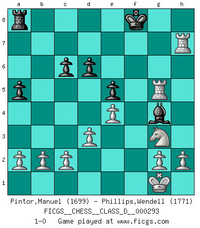 Last move : 1-0 2023 March 19 0:57:34 [Event "FICGS__CHESS__CLASS_D__000293"] [Site "FICGS"] [Date "2023.03.14"] [Round "1"] [White "Pintor,Manuel"] [Black "Phillips,Wendell"] [Result "1-0"] [WhiteElo "1699"] [BlackElo "1771"] 1.e4 d6 2.f4 c6 3.Nf3 Nd7 4.Bc4 h6 5.O-O Ngf6 6.Nc3 Qc7 7.d3 e5 8.f5 Be7 9.Nh4 Nh7 10.Qh5 O-O 11.Ng6 Re8 12.Bxf7+ Kxf7 13.Nh8+ Kg8 14.Qxe8+ Bf8 15.Nf7 Ndf6 16.Nxh6+ gxh6 17.Qg6+ Qg7 18.Ne2 Qxg6 19.fxg6 Ng5 20.Rxf6 Be7 21.Bxg5 hxg5 22.Rf7 Bf8 23.Raf1 Be6 24.Rxb7 Bg4 25.Ng3 a5 26.R1f7 Be6 27.Rh7 Bg4 28.g7 Bxg7 29.Rbxg7+ Kf8 30.Rxg5 1-0 Follow this game move after move (download)During a Chess competition a Chessmaster should be a combination of a beast of prey and a monk. (Alexander Alekhine) Ich habe kein Problem mit Frauen, sondern nur mit dem Niveau ihres Schachspiels (Judith Polgar) Creo que una cierta cantidad de temperamento es esperada de los genios del Ajedrez. (Ron Gross) Donnez-moi un Cavalier en 6e et je gagnerais toutes mes parties. (Steinitz) Men never do evil so completely and cheerfully as when they do it from religious conviction. (Blaise Pascal)