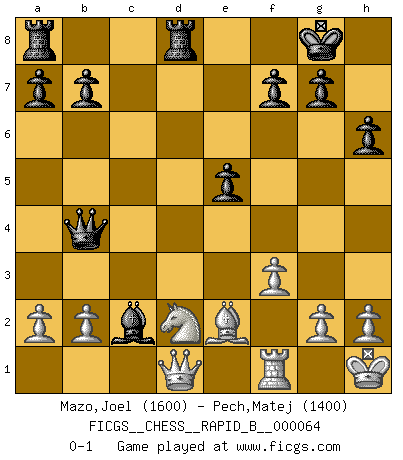 Last move : 0-1 2007 November 19 10:17:39 [Event "FICGS__CHESS__RAPID_B__000064"] [Site "FICGS"] [Date "2007.08.24"] [Round "1"] [White "Mazo,Joel"] [Black "Pech,Matej"] [Result "0-1"] [WhiteElo "1600"] [BlackElo "1400"] 1.e4 c5 2.Nf3 Nc6 3.d4 cxd4 4.Nxd4 Nf6 5.Nc3 e5 6.Nb3 Bb4 7.Bg5 h6 8.Bd2 Bxc3 9.Bxc3 O-O 10.f3 d5 11.exd5 Nxd5 12.Bd2 Bf5 13.Be2 Ncb4 14.Bxb4 Nxb4 15.O-O Qb6+ 16.Kh1 Nxc2 17.Rc1 Rfd8 18.Nd2 Qb4 19.Rxc2 Bxc2 0-1 Sicilian : Pelikan (Lasker/Sveshnikov) variation Kingside Castling by player Black (move 9) Kingside Castling by player White (move 15) Player Black won this chess game. Follow this game move after move (download)In Chess, as it is played by masters, chance is practically eliminated. (Emanuel Lasker) In Buenos Aires ist es nicht mein vorrangiges Ziel ein starkes Turnier zu organisieren, sondern ein Turnier für Gentlemen. Ich würde nie Kamsky einladen. Ich mag keine Probleme. (Miguel Najdorf) Preferería tener un Peón que un dedo. (Reuben Fine) Comme les marins qui ont mille raisons différentes d'aller en mer, les joueurs d'échecs en ont tout autant avant de s'installer devant une table et jouer... (Vincent Bertignac, philosophe) Difficult things take a long time, impossible things a little longer. (Author unknown)