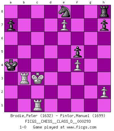 Last move : 1-0 2023 September 25 1:16:30 [Event "FICGS__CHESS__CLASS_D__000293"] [Site "FICGS"] [Date "2023.03.14"] [Round "1"] [White "Brodie,Peter"] [Black "Pintor,Manuel"] [Result "1-0"] [WhiteElo "1632"] [BlackElo "1699"] 1.e4 e5 2.Nf3 Nc6 3.Bb5 Qf6 4.Nc3 Qg6 5.g3 Bc5 6.Bxc6 dxc6 7.Nxe5 Qd6 8.Nd3 Bd4 9.Ne2 Bb6 10.b4 Qf6 11.e5 Qf3 12.Rg1 Bf5 13.Nef4 Qe4+ 14.Qe2 Qc4 15.c3 O-O-O 16.Nb2 Qxe2+ 17.Nxe2 c5 18.bxc5 Bxc5 19.d4 Ba3 20.Nc4 Bxc1 21.Rxc1 Bd3 22.Nb2 Bxe2 23.Kxe2 Ne7 24.f4 Nd5 25.c4 Ne7 26.Rcd1 Nc6 27.d5 Nb4 28.a3 Na6 29.Rd2 Nc5 30.Nd3 Ne4 31.Rc2 b6 32.Ke3 f5 33.g4 g6 34.e6 b5 35.cxb5 Rxd5 36.Rgc1 Rxb5 37.Rxc7+ Kb8 38.Ne5 Rb3+ 39.Kd4 Rxa3 40.Nd7+ Ka8 41.gxf5 gxf5 42.e7 Nd6 43.R7c6 Ne8 44.Rc8+ Kb7 45.Rb8+ Ka6 46.Nc5+ Ka5 47.Nb3+ Rxb3 48.Rxb3 Ka4 49.Kc3 1-0 Follow this game move after move (download)I still hope to kill Fischer. (Boris Spassky) Irgendwie scheint mir sonntags früh um 9 Uhr der Killerinstinkt verloren gegangen zu sein. (Alexej Shirov) Después de la respuesta de las negras a 1.e4 con 1..e5, se quedan siempre tratando de entrar dentro del juego. (Howard Staunton) Botvinnik disait en comparant les échecs à la musique: Il existe une science dont le but est l'étude de l'acoustique et des sons. Mais il y a aussi un art qui se sert de l'océan des sons : c'est la musique. De toute évidence, il en est de même pour la pensée. La logique est l'étude des lois de la réflexion et les échecs reflètent, en tant qu'art, le côté logique de la réflexion, sous la forme d'images artistiques... Extrait de Fischer - Spassky, Reykjavik 1972 par Alexander & F. Wyndham (Ed. Solar), p 37. The absolute truth is the thing that makes people laugh. (Carl Reiner)