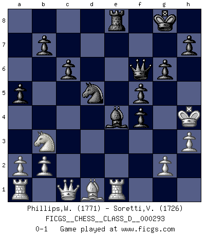 Last move : 0-1 2023 March 27 8:24:56 [Event "FICGS__CHESS__CLASS_D__000293"] [Site "FICGS"] [Date "2023.03.14"] [Round "1"] [White "Phillips,Wendell"] [Black "Soretti,Vincenzo"] [Result "0-1"] [WhiteElo "1771"] [BlackElo "1726"] 1.d3 Nf6 2.e4 d6 3.Be2 e5 4.c3 Be7 5.h3 Be6 6.Nd2 Nbd7 7.Qc2 O-O 8.Nf1 a5 9.Ng3 Re8 10.Nf3 Nf8 11.Bd2 Ng6 12.Qc1 d5 13.Bg5 dxe4 14.dxe4 c6 15.O-O Qc7 16.Re1 Rad8 17.Bd1 Nf4 18.Bxf4 exf4 19.Nf1 Bc5 20.Qc2 Bc4 21.N1d2 Bd3 22.Qc1 Bxf2+ 23.Kxf2 Qb6+ 24.Nd4 Rxd4 25.cxd4 Qxd4+ 26.Kf3 Nd5 27.Nb3 Bxe4+ 28.Kg4 f5+ 29.Kh5 g6+ 30.Kh4 Qf6+ 0-1 Follow this game move after move (download)Chess is in its essence a game, in its form an art, and in its execution a science. (Baron Tassilo) Gewinnen beim Schach fördert das Selbstvertrauen. Beim Sex spüre ich sowas nicht... (Garry Kasparov) a manera como él juega al Ajedrez, demuestra la completa naturaleza de un hombre. (Stanley Ellin) 'L'échange des dames est un coup dur pour les deux adversaires...' Un journaliste lors d'une partie du match Spassky-Fischer A government big enough to give you everything you want is strong enough to take everything you have. (Thomas Jefferson)