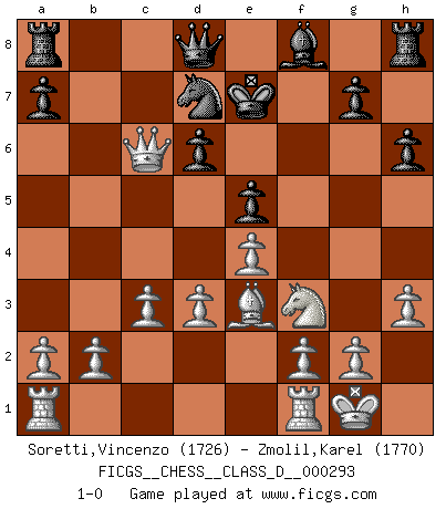 Last move : 1-0 2023 March 23 17:21:1 [Event "FICGS__CHESS__CLASS_D__000293"] [Site "FICGS"] [Date "2023.03.14"] [Round "1"] [White "Soretti,Vincenzo"] [Black "Zmolil,Karel"] [Result "1-0"] [WhiteElo "1726"] [BlackElo "1770"] 1.e4 e5 2.Nf3 Nc6 3.Bc4 h6 4.d3 d6 5.Be3 Bg4 6.Nbd2 Nd4 7.Bxf7+ Ke7 8.Bc4 Kd7 9.O-O Nf6 10.c3 Nxf3+ 11.Nxf3 c6 12.h3 Be6 13.Bxe6+ Kxe6 14.Qb3+ Ke7 15.Qxb7+ Nd7 16.Qxc6 1-0 Follow this game move after move (download)The only thing Chess players have in common is Chess. (Lodewijk Prins) Garry Kasparov war erst in der Großmeister-Organisation GMA, dann in der Profischach-Vereinigung PCA, zum Schluss kehrte er wieder in den Schoß der FIDE zurück. Aber gut, manche Leute sind flexibel (Viswanathan Anand) Las ideas audaces son como las piezas del Ajedrez que avanzan hacia adelante. Ellas pueden ser vencidas, pero también pueden iniciar una partida victoriosa. (Goethe) Les Echecs ne sont pas pour les âmes timides. Ils requièrent un homme entier, qui ne s'arrête pas aveuglément à ce qui a été déjà établi, mais qui tente individuellement de sonder les profondeurs du jeu. (W. Steinitz) The Movers & Shakers of this world are those who play chess in the mornings and go to the disco in the evenings. (Dinesh De Silva)