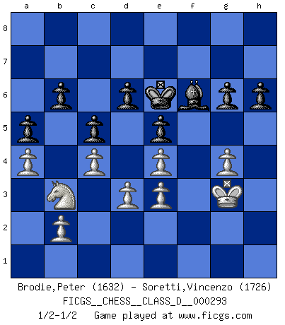 Last move : 1/2-1/2 2023 May 19 11:1:38 [Event "FICGS__CHESS__CLASS_D__000293"] [Site "FICGS"] [Date "2023.03.14"] [Round "1"] [White "Brodie,Peter"] [Black "Soretti,Vincenzo"] [Result "1/2-1/2"] [WhiteElo "1632"] [BlackElo "1726"] 1.e4 c5 2.c4 d6 3.Nc3 Nc6 4.Nf3 e5 5.Be2 Nf6 6.d3 h6 7.O-O Be7 8.Be3 Ng4 9.Nd5 Nxe3 10.fxe3 Be6 11.Qb3 Qd7 12.Kh1 O-O 13.Rad1 Bd8 14.a3 Ne7 15.Nxe7+ Qxe7 16.Qc2 g5 17.h3 g4 18.hxg4 Bxg4 19.Nh2 Bxe2 20.Qxe2 Qh4 21.Qf2 Qh5 22.g4 Qg6 23.Qf5 Bg5 24.Qxg6+ fxg6 25.Rde1 Rf6 26.Rxf6 Bxf6 27.Rf1 Bg5 28.Rf3 Rf8 29.Kg2 Rxf3 30.Kxf3 Kf7 31.Nf1 a5 32.a4 b6 33.Nd2 Ke6 34.Nb3 Bf6 35.Kg3 1/2-1/2 Follow this game move after move (download)The way he plays Chess demonstrates a man's whole nature. (Stanley Ellin) Ich kenne Menschen, die allen Willen der Welt besitzen und doch nicht Schach spielen können. (Robert James Fischer) Morphy probablemente fue el genio más grande de todos. (Bobby Fischer) Comme les marins qui ont mille raisons différentes d'aller en mer, les joueurs d'échecs en ont tout autant avant de s'installer devant une table et jouer... (Vincent Bertignac, philosophe) Art is the triumph over chaos. (John Cheever)