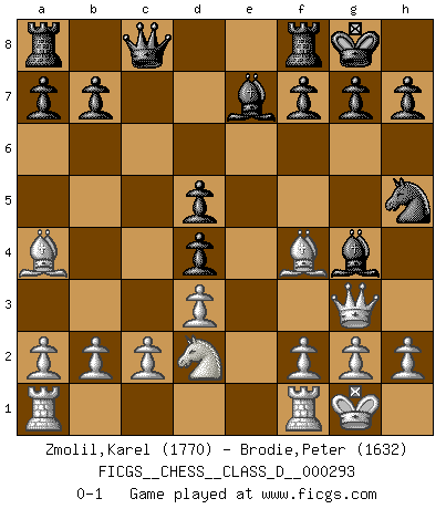 Last move : 0-1 2023 March 26 9:21:2 [Event "FICGS__CHESS__CLASS_D__000293"] [Site "FICGS"] [Date "2023.03.14"] [Round "1"] [White "Zmolil,Karel"] [Black "Brodie,Peter"] [Result "0-1"] [WhiteElo "1770"] [BlackElo "1632"] 1.e4 e5 2.Nf3 Nc6 3.Bb5 Nd4 4.Nxd4 exd4 5.O-O c6 6.Bc4 Nf6 7.d3 d5 8.exd5 cxd5 9.Bb3 Be7 10.Qf3 O-O 11.Bf4 Bg4 12.Qg3 Qd7 13.Nd2 Nh5 14.Ba4 Qc8 0-1 Follow this game move after move (download)I had a toothache during the first game. In the second game I had a headache. In the third game it was an attack of rheumatism. In the fourth game, I wasn't feeling well. And in the fifth game? Well, must one have to win every game ? (Siegbert Tarrasch) Wenn Du absolut nicht mehr weißt, was Du tun sollst, dann ist es Zeit für Panik. (John van der Wiel) El Ajedrez no es como la vida... ¡tiene reglas!. (Mark Pasternak) Mais l'homme est une créature légère et illogique : semblable au joueur d'échecs, il n'aime que le processus du but à atteindre, non le but lui-même. (Dostoïevsky) Gambling : The sure way of getting nothing from something. (Wilson Mizner)