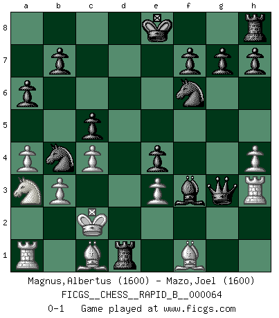 Last move : 0-1 2007 October 24 8:1:50 [Event "FICGS__CHESS__RAPID_B__000064"] [Site "FICGS"] [Date "2007.08.24"] [Round "1"] [White "Magnus,Albertus"] [Black "Mazo,Joel"] [Result "0-1"] [WhiteElo "1600"] [BlackElo "1600"] 1.h4 d5 2.e3 e5 3.g3 c5 4.Nf3 Nc6 5.b3 Nf6 6.a4 Bd6 7.d3 Qc7 8.Na3 a6 9.c4 e4 10.dxe4 dxe4 11.Nd2 Bxg3 12.fxg3 Qxg3+ 13.Ke2 Bg4+ 14.Nf3 Bxf3+ 15.Kd2 Rd8+ 16.Kc2 Rxd1 17.Rh3 Nb4+ 0-1 This chess game has been lost on time (started : 2007.08.24 20:11:52) Anti-Borg (Desprez) Opening Player Black won this chess game. Follow this game move after move (download)Chess is played with the mind and not with the hands ! (Renaud and Kahn) Der Verteidiger gebe der Gewalt nach, aber nur der Gewalt. Er schaffe sich nicht freiwillig, etwa aus Blindheit oder aus Schrecken, irgendwelche Schwächen. Er lasse sich nicht bluffen. (Emanuel Lasker) El Ajedrez es el gimnasio de la mente. (Blaise Pascal) Horreur, mais aussi harmonie suprême : qu'y avait-il en effet au monde en dehors des échecs ? Le brouillard, l'inconnu, le non-être... (Vladimir Nabokov) The arrogant army will lose certainly the battle. (Chinese proverb)
