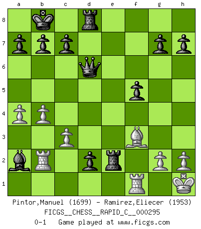 Last move : 0-1 2023 March 31 23:26:54 [Event "FICGS__CHESS__RAPID_C__000295"] [Site "FICGS"] [Date "2023.03.18"] [Round "1"] [White "Pintor,Manuel"] [Black "Ramirez,Eliecer"] [Result "0-1"] [WhiteElo "1699"] [BlackElo "1953"] 1.e4 d5 2.exd5 Qxd5 3.f4 Nc6 4.Nf3 Bg4 5.Be2 O-O-O 6.c3 e5 7.O-O e4 8.Ne5 Nxe5 9.fxe5 Be6 10.d4 exd3 11.Bf3 Qxe5 12.Bf4 Qc5+ 13.Kh1 Bd6 14.b4 Qb6 15.Bxd6 Qxd6 16.Nd2 Nf6 17.Ne4 Nxe4 18.Bxe4 f5 19.Bf3 d2 20.a4 Rhe8 21.Qe2 Kb8 22.Rab1 Ba2 23.Rb2 Rxe2 0-1 Follow this game move after move (download)The passed Pawn is a criminal, who should be kept under lock and key. Mild measures, such as police surveillance, are not sufficient. (Aaron Nimzovich) Wie kann ich Remis annehmen? Ich weiß ja gar nicht, wie ich stehe! (Fritz Sämisch) Cuando veas una buena jugada, trata de encontrar otra mejor. (Emanuel Lasker) A ce moment-là, je menaçais de comprendre la position ! (Clément L'Heureux) All war is based on deception. (Sun Tzu)