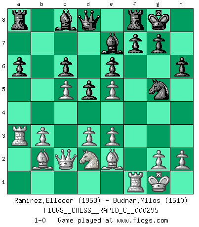 Last move : 1-0 2023 April 4 6:54:42 [Event "FICGS__CHESS__RAPID_C__000295"] [Site "FICGS"] [Date "2023.03.18"] [Round "1"] [White "Ramirez,Eliecer"] [Black "Budnar,Milos"] [Result "1-0"] [WhiteElo "1953"] [BlackElo "1510"] 1.f4 d5 2.Nf3 Nf6 3.e3 h6 4.b3 e6 5.Be2 a6 6.O-O Be7 7.c4 O-O 8.Bb2 Nc6 9.Ne5 Nxe5 10.fxe5 Ne4 11.d3 Ng5 12.Qc2 b5 13.c5 c6 14.Nd2 b4 15.a3 bxa3 16.Rxa3 1-0 Follow this game move after move (download)The enormous mental resilience, without which no Chess player can exist, was so much taken up by Chess that he could never free his mind of this game. (Albert Einstein) Sie bekommen vielleicht den Eindruck, dass die Spitzenspieler überhaupt gar nicht so stark sind. Aber das stimmt nicht. Es ist eine Illusion. Mit einem Computer an der Seite ist es sehr leicht, Urteile zu fällen, aber wenn man alleine am Brett sitzt, sieht die Sache ganz anders aus. (Vladimir Kramnik) Después de una mala apertura, hay una esperanza en el juego medio. Pero una vez que estas en finales, el momento de la verdad ha llegado. (Edmar Mednis) On peut tirer plus d'utilité d'une partie perdue que de 100 parties gagnées. (Capablanca) Computers make it easier to do a lot of things, but most of the things they make it easier to do don't need to be done. (Andy Rooney)