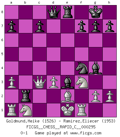 Last move : 0-1 2023 May 13 8:1:14 [Event "FICGS__CHESS__RAPID_C__000295"] [Site "FICGS"] [Date "2023.03.18"] [Round "1"] [White "Goldmund,Heike"] [Black "Ramirez,Eliecer"] [Result "0-1"] [WhiteElo "1526"] [BlackElo "1953"] 1.b4 e5 2.Bb2 Bxb4 3.Bxe5 Nf6 4.a3 Ba5 5.c4 O-O 6.Nf3 Re8 7.e3 d5 8.cxd5 Nxd5 9.Be2 Nd7 10.Bb2 N7f6 11.O-O Ne4 12.Qa4 Bb6 13.d3 Nxf2 14.Kxf2 Bxe3+ 15.Ke1 b5 16.Qxb5 Bg4 17.Qc4 Rb8 18.Qc2 Nf4 19.Qc3 Rxb2 0-1 This chess game has been lost on time (started : 2023.03.18 12:29:9) Follow this game move after move (download)Whoever sees no other aim in the game than that of giving checkmate to one's opponent will never become a good Chess player. (Euwe) Wenn ich Weiß habe gewinne ich weil ich Weiß habe, wenn ich Schwarz habe gewinne ich weil ich Bogoljubov bin. (Efim Bogoljubov) Si no le temes a Spassky, entonces elimino el elemento del dinero. (Jim Slater) Le moment que je préfère le plus dans une rencontre, c'est celui où je sens que la personnalité de l'adversaire se brise. (Robert Fischer) Think like a man of action, act like a man of thought. (Henri Louis Bergson)