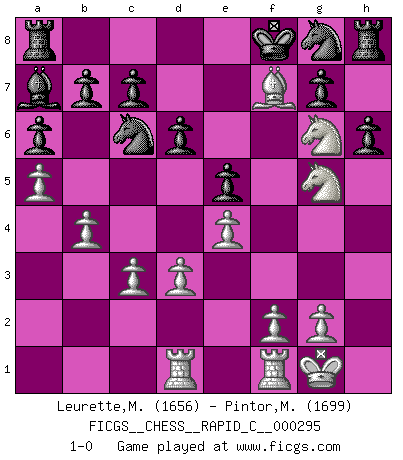 Last move : 1-0 2023 March 22 19:25:58 [Event "FICGS__CHESS__RAPID_C__000295"] [Site "FICGS"] [Date "2023.03.18"] [Round "1"] [White "Leurette,Marc-Antoine"] [Black "Pintor,Manuel"] [Result "1-0"] [WhiteElo "1656"] [BlackElo "1699"] 1.e4 e5 2.Nf3 Nc6 3.Bc4 Bc5 4.c3 Qf6 5.b4 Bb6 6.a4 a6 7.a5 Ba7 8.d3 d6 9.O-O Bg4 10.Nbd2 Qg6 11.h3 Bxh3 12.Nh4 Qf6 13.Ndf3 Bg4 14.Bg5 Qxg5 15.Nxg5 Bxd1 16.Bxf7+ Kf8 17.Raxd1 h6 18.Ng6+ 1-0 Follow this game move after move (download)Chess, like any creative activity, can exist only through the combined efforts of those who have creative talent, and those who have the ability to organize their creative work. (Mikhail Botvinnik) Wir irren allesamt, nur jeder irrt anders. (Georg Christoph Lichtenberg) La captura del Rey enemigo es la finalidad pero no el primer objetivo de la partida. (William Steinitz) Toutes les manuvres exécutées sur une colonne ouverte ont pour but ultime l'intrusion définitive sur la septième ou la huitième rangée, en plein cur de la position ennemie. (Aaron Nimzovitch) The human is the only animal species whose members are able to talk themselves into difficulties that would not otherwise exist. (Wendell Johnson)