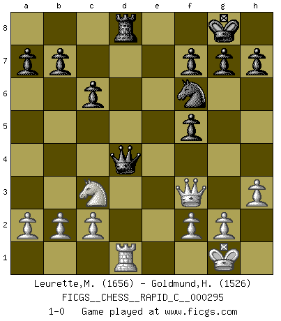 Last move : 1-0 2023 May 10 14:27:18 [Event "FICGS__CHESS__RAPID_C__000295"] [Site "FICGS"] [Date "2023.03.18"] [Round "1"] [White "Leurette,Marc-Antoine"] [Black "Goldmund,Heike"] [Result "1-0"] [WhiteElo "1656"] [BlackElo "1526"] 1.e4 d5 2.exd5 Qxd5 3.Nc3 Qa5 4.d4 Nf6 5.Nf3 Bg4 6.Be2 e6 7.h3 Bf5 8.O-O c6 9.Bd2 Qc7 10.Be3 Be7 11.Bd3 O-O 12.Bxf5 exf5 13.Ne5 Nbd7 14.Bf4 Bd6 15.Re1 Rad8 16.Qf3 Rfe8 17.Nxd7 Qxd7 18.Bxd6 Qxd6 19.Rad1 Rxe1+ 20.Rxe1 Qxd4 21.Rd1 1-0 This chess game has been lost on time (started : 2023.03.18 12:29:9) Follow this game move after move (download)It is no time to be playing Chess when the house is on fire. (Italian Proverb) Charakterschwächen offenbaren sich normalerweise während einer Schachpartie. (Garry Kasparov) Aún el Rey más flojo huye despavorido ante la amenaza de un Jaque doble. (Aaron Nimzowitsch) Seul un grand joueur sait à quel point il joue faiblement. (Xavier Tartacover) Fortune favours the audacious. (Desiderius Erasmus)