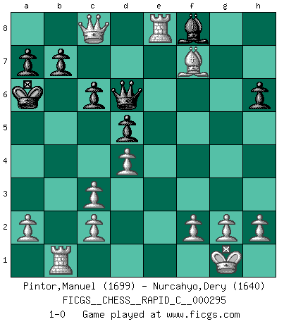 Last move : 1-0 2023 April 28 17:3:44 [Event "FICGS__CHESS__RAPID_C__000295"] [Site "FICGS"] [Date "2023.03.18"] [Round "1"] [White "Pintor,Manuel"] [Black "Nurcahyo,Dery"] [Result "1-0"] [WhiteElo "1699"] [BlackElo "1640"] 1.e4 f5 2.exf5 Nf6 3.Be2 d5 4.Bh5+ Kd7 5.d4 Ne4 6.Nf3 Nc6 7.Bf4 Nf6 8.Bf7 Ne4 9.Nc3 Nxc3 10.bxc3 h6 11.Qe2 e5 12.Bxe5 Ne7 13.Bxg7 c6 14.Bxh8 Nxf5 15.Qe6+ Kc7 16.Be5+ Nd6 17.Qg6 Bf5 18.Bxd6+ Qxd6 19.Qxf5 Qe7+ 20.Ne5 Rd8 21.O-O Bg7 22.Rfe1 Rf8 23.Qf4 Qd6 24.Qf5 Kb8 25.Nd7+ Kc7 26.Nxf8 Bxf8 27.Re8 Kb6 28.Rb1+ Ka6 29.Qc8 1-0 Follow this game move after move (download)The Pawns are the soul of the game. (Francois Andre Danican Philidor) Das Spiel gibt uns die Genugtuung, die das Leben uns versagt. (Emanuel Lasker) El Ajedrez es un terrible juego. Si no controlas el centro, tu oponente tiene una posición mas holgada. Si tienes control del centro, ¡entonces realmente tu tienes algo de que preocuparte!. (Siegbert Tarrasch) Psychologiquement, tu dois avoir confiance en toi même, mais cette confiance doit être basée sur des faits. (Robert Fischer) There is no instance of a country having benefited from prolonged warfare. (Sun Tzu)