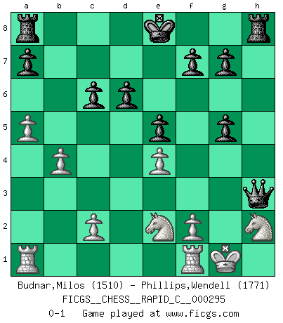 Last move : 0-1 2023 March 28 18:47:32 [Event "FICGS__CHESS__RAPID_C__000295"] [Site "FICGS"] [Date "2023.03.18"] [Round "1"] [White "Budnar,Milos"] [Black "Phillips,Wendell"] [Result "0-1"] [WhiteElo "1510"] [BlackElo "1771"] 1.e4 d6 2.d4 c6 3.h3 Qc7 4.Nf3 e5 5.Be2 h6 6.O-O Be7 7.Nc3 Nd7 8.d5 Nf8 9.Be3 Ng6 10.a3 Nf6 11.dxc6 bxc6 12.b4 Bd7 13.a4 Qc8 14.a5 Bxh3 15.gxh3 Qxh3 16.Nh2 Nh4 17.Bf3 Ng4 18.Nxg4 Nxf3+ 19.Qxf3 Qxf3 20.Nh2 Qh3 21.Ne2 Bg5 22.Bxg5 hxg5 0-1 Follow this game move after move (download)All I want to do, ever, is just play Chess. (Bobby Fischer) Kritik überlasse ich den Spießern. Ich zeige nichts, wofür ich mich schämen muss. (Alexandra Kosteniuk) El pensamiento metódico es mas útil en el Ajedrez que la inspiración. (C. J. S. Purdy) En blitz, le Cavalier l'emporte sur le Fou. (Vlastimil Hort) Question: Is 'This statement is paradoxical' a paradoxical statement ? Or is it a meta-paradox ? (Normajean Yates)