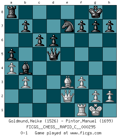 Last move : 0-1 2023 May 11 16:59:39 [Event "FICGS__CHESS__RAPID_C__000295"] [Site "FICGS"] [Date "2023.03.18"] [Round "1"] [White "Goldmund,Heike"] [Black "Pintor,Manuel"] [Result "0-1"] [WhiteElo "1526"] [BlackElo "1699"] 1.e4 e5 2.Nf3 Nc6 3.Bc4 Bc5 4.c3 Qf6 5.a4 a5 6.d4 exd4 7.cxd4 Nxd4 8.O-O d6 9.Nbd2 Be6 10.Bxe6 Nxe6 11.Qe2 c6 12.Nb3 Bb4 13.Nbd2 Ne7 14.Nc4 O-O 15.b3 Qxa1 16.Nb6 Nd4 17.Nxd4 Qxd4 18.Nxa8 Rxa8 19.Be3 Qxe4 20.f3 Qd5 0-1 This chess game has been lost on time (started : 2023.03.18 12:29:9) Follow this game move after move (download)Chess is like war on a board. (Bobby Fischer) Ich hatte Angst gegen einen russischen Großmeister zu verlieren, und er befürchtete gegen einen kleinen Jungen zu verlieren. (über ein Remis gegen Juri Awerbach). (Robert James Fischer) El Ajedrez es realmente noventa y nueve por ciento calculación. (Soltis) Si le désir cupide (et stupide) de gagner est une inépuisable source de souffrance, une combinaison brillante sur l'échiquier est une découverte : le coquelicot qui s'épanouit lorsque apparaît la Voie Lactée. (Arrabal) I've lost money so fast in these clubs it's left me reeling. I've read every poker book ever written, but the only way to get better at the game is to go out and play with people who are really good. The problem is, you stand to lose a lot of money doing it. (Matt Damon)