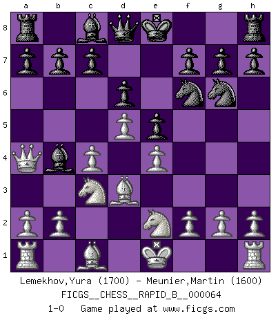 Last move : 1-0 2007 August 31 3:51:7 [Event "FICGS__CHESS__RAPID_B__000064"] [Site "FICGS"] [Date "2007.08.24"] [Round "1"] [White "Lemekhov,Yura"] [Black "Meunier,Martin"] [Result "1-0"] [WhiteElo "1700"] [BlackElo "1600"] 1.d4 Nf6 2.c4 Nc6 3.Nc3 e5 4.d5 Ne7 5.e4 Ng6 6.Bd3 Bb4 7.Nge2 d6 8.Qa4+ 1-0 Kevitz-Trajkovich defense Player White won this chess game. Follow this game move after move (download)A Chess game is divided into three stages: the first, when you hope you have the advantage, the second when you believe you have an advantage, and the third... when you know you're going to lose ! (Savielly Tartakower) Es gibt keine einzige Frau, der ich nicht einen Springer vorgeben könnte und trotzdem gewänne. (Robert James Fischer) El Ajedrez es la vida. (Bobby Fischer) Tous ces prétendus hommes politiques sont les pions, les Cavaliers, les Tours ou les Fous d'une partie d'échecs qui se jouera tant qu'un hasard ne renversera pas l'échiquier. (Honoré de Balzac) A belief is an idea the mind possesses, an idea that possesses the mind. (Robert Oxden Bolton)