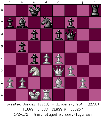 Last move : 1/2-1/2 2023 May 8 4:49:24 [Event "FICGS__CHESS__CLASS_A__000267"] [Site "FICGS"] [Date "2023.03.18"] [Round "1"] [White "Swiatek,Janusz"] [Black "Wiaderek,Piotr"] [Result "1/2-1/2"] [WhiteElo "2213"] [BlackElo "2238"] 1.d4 d5 2.c4 c6 3.Nf3 Nf6 4.Nc3 e6 5.Bg5 h6 6.Bh4 dxc4 7.e4 g5 8.Bg3 b5 9.Be2 Bb7 10.Ne5 Bg7 11.h4 Nbd7 12.hxg5 hxg5 13.Rxh8+ Bxh8 14.Qd2 Nxe5 15.Bxe5 Qa5 16.f3 O-O-O 17.Qxg5 Nd7 18.Bxh8 Rxh8 19.O-O-O Qd8 20.Qf4 Qf6 21.Qe3 1/2-1/2 Follow this game move after move (download)Fischer sacrificed virtually everything most of us weakies (to use his term) value, respect, and cherish, for the sake of an artful, often beautiful board game, for the ambivalent privilege of being its greatest master. (Paul Kollar) Es gibt keine einzige Frau, der ich nicht einen Springer vorgeben könnte und trotzdem gewänne. (Robert James Fischer) Me dio la sensación de como si yo estuviera jugando en contra del mismo Ajedrez. - al estar jugando en contra de Robert Fischer (Walter Shipman) Avec des compensations pour le matériel en plus... (Anonyme) We need strong personalities and only one world champion to attract sponsors. (Anatoly Karpov)