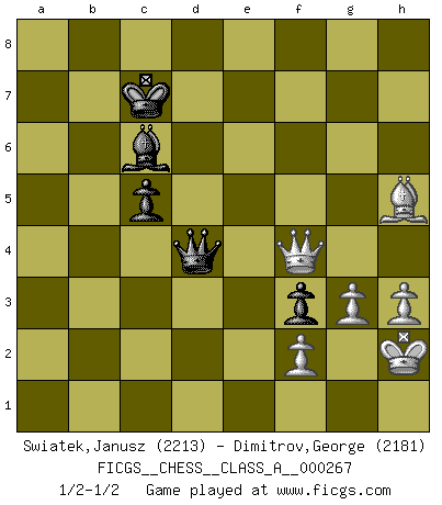 Last move : 1/2-1/2 2023 December 16 10:8:34 [Event "FICGS__CHESS__CLASS_A__000267"] [Site "FICGS"] [Date "2023.03.18"] [Round "1"] [White "Swiatek,Janusz"] [Black "Dimitrov,George"] [Result "1/2-1/2"] [WhiteElo "2213"] [BlackElo "2181"] 1.d4 d5 2.c4 c6 3.Nf3 Nf6 4.Nc3 e6 5.Bg5 h6 6.Bh4 dxc4 7.e4 g5 8.Bg3 b5 9.Ne5 Bb7 10.Be2 Nbd7 11.O-O Bg7 12.Nxd7 Nxd7 13.Bd6 a6 14.a4 e5 15.Bg4 exd4 16.e5 c5 17.Re1 Nxe5 18.Bxe5 O-O 19.Bxg7 Kxg7 20.Ne2 f5 21.Bh5 f4 22.b3 Kh8 23.axb5 axb5 24.bxc4 bxc4 25.Qc2 Rxa1 26.Rxa1 c3 27.Nxc3 dxc3 28.Rd1 Qe7 29.Qxc3+ Kg8 30.Qb3+ Kg7 31.Qc3+ Kg8 32.Qb3+ Kg7 33.h3 Bc6 34.Qc3+ Kg8 35.Re1 Qd6 36.Rd1 Qe7 37.Qc2 Rf6 38.Kh2 f3 39.g3 Re6 40.Bg4 Rf6 41.Bh5 Re6 42.Bg4 Rf6 43.Qa2+ Kh7 44.Bh5 Re6 45.Rd8 Qxd8 46.Qxe6 Qd4 47.Qg6+ Kh8 48.Qxh6+ Kg8 49.Qxg5+ Kf8 50.Qf5+ Ke7 51.Qf7+ Kd8 52.Qf8+ Kc7 53.Qf4+ 1/2-1/2 Follow this game move after move (download)What is the object of playing a gambit opening?... To acquire a reputation of being a dashing player at the cost of losing a game. (Siegbert Tarrasch) Irgendwie scheint mir sonntags früh um 9 Uhr der Killerinstinkt verloren gegangen zu sein. (Alexej Shirov) La captura del Rey enemigo es la finalidad pero no el primer objetivo de la partida. (William Steinitz) Les pièces de l'échiquier étaient impitoyables. Elles le retenaient, elles l'absorbaient. Il y avait de l'horreur en cela, mais aussi une harmonie unique. Car, qu'y a-t-il dans le monde, à part les échecs ? (V. Nabokov) Nothing is more important for teaching us to understand the concepts we have than constructing fictitious ones. (Ludwig Wittgenstein)