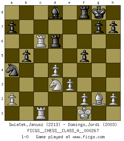 Last move : 1-0 2023 November 13 23:24:18 [Event "FICGS__CHESS__CLASS_A__000267"] [Site "FICGS"] [Date "2023.03.18"] [Round "1"] [White "Swiatek,Janusz"] [Black "Domingo,Jordi"] [Result "1-0"] [WhiteElo "2213"] [BlackElo "2003"] 1.d4 Nf6 2.c4 e6 3.g3 d5 4.Bg2 Bb4+ 5.Bd2 Be7 6.Nf3 O-O 7.O-O c6 8.Qc2 b6 9.Ne5 Bb7 10.Bf4 Nbd7 11.Rd1 Nh5 12.Bd2 Nhf6 13.cxd5 cxd5 14.Nc6 Bxc6 15.Qxc6 Rc8 16.Qb5 Ne8 17.Qa6 Nb8 18.Qd3 Nc6 19.Nc3 Nd6 20.Be1 f5 21.e3 Qe8 22.Rdc1 Qf7 23.Qd1 Nc4 24.Qa4 f4 25.gxf4 Qg6 26.Qc2 Qxc2 27.Rxc2 Nb4 28.Re2 Nd3 29.Bh3 Rc6 30.f5 exf5 31.Nxd5 Rg6+ 32.Kf1 Bh4 33.Bg2 Ncxb2 34.Bb4 Nxb4 35.Nxb4 Na4 36.Rc2 b5 37.Nd3 Rd6 38.Rac1 Bd8 39.Rc6 1-0 This chess game has been lost on time (started : 2023.03.18 14:13:43) Follow this game move after move (download)Different people feel differently about resigning. (Bobby Fischer) Wie, soll nun auch die Opposition abgeschafft werden? Ja, es tut mir leid, Ihnen diesen Schmerz nicht ersparen zu können. (Aaron Nimzowitsch) No hay precio que sea tan grande por la cabellera del Rey enemigo. (Koblentz) Que feriez-vous si vous étiez en train de jouer aux échecs et que la fin du monde arrive ? Je continuerais à jouer. (Saint Borromée) If passion drives you, let reason holds the reins. (Benjamin Franklin)