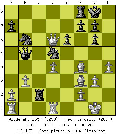 Last move : 1/2-1/2 2023 August 24 13:41:26 [Event "FICGS__CHESS__CLASS_A__000267"] [Site "FICGS"] [Date "2023.03.18"] [Round "1"] [White "Wiaderek,Piotr"] [Black "Pech,Jaroslav"] [Result "1/2-1/2"] [WhiteElo "2238"] [BlackElo "2037"] 1.d4 d5 2.c4 c6 3.Nf3 Nf6 4.e3 Bf5 5.Nc3 e6 6.Nh4 Bg6 7.Be2 Nbd7 8.O-O Bd6 9.g3 O-O 10.Nxg6 hxg6 11.Qc2 dxc4 12.Bxc4 c5 13.Be2 cxd4 14.exd4 Rc8 15.Bf3 b5 16.Qb3 b4 17.Nb5 Qb6 18.Nxd6 Qxd6 19.Rd1 Nb6 20.Bf4 Qd7 21.Qxb4 Nfd5 22.Qd6 Qb5 23.b3 Rc2 24.h4 1/2-1/2 Follow this game move after move (download)I believe that Chess possesses a magic that is also a help in advanced age. A rheumatic knee is forgotten during a game of Chess and other events can seem quite unimportant in comparison with a catastrophe on the chessboard. (Vlastimil Hort) Garry Kasparov war erst in der Großmeister-Organisation GMA, dann in der Profischach-Vereinigung PCA, zum Schluss kehrte er wieder in den Schoß der FIDE zurück. Aber gut, manche Leute sind flexibel (Viswanathan Anand) El Ajedrez es un terrible juego. Si no controlas el centro, tu oponente tiene una posición mas holgada. Si tienes control del centro, ¡entonces realmente tu tienes algo de que preocuparte!. (Siegbert Tarrasch) Un journaliste : 'Vous préférez avoir une dame de plus sur l'échiquier ou au lit ?' Boris Spassky : 'Ca dépend de la position.' Animated gif is worth one mega-word. (Unknown)