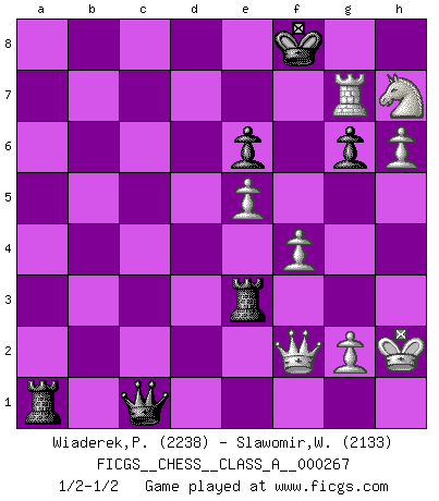 Last move : 1/2-1/2 2023 June 16 7:59:54 [Event "FICGS__CHESS__CLASS_A__000267"] [Site "FICGS"] [Date "2023.03.18"] [Round "1"] [White "Wiaderek,Piotr"] [Black "Slawomir,Weglicki"] [Result "1/2-1/2"] [WhiteElo "2238"] [BlackElo "2133"] 1.d4 e6 2.e4 d5 3.Nc3 Nf6 4.e5 Nfd7 5.f4 c5 6.Nf3 Nc6 7.Be3 Be7 8.Qd2 a6 9.Bd3 b5 10.Qf2 b4 11.Na4 c4 12.Be2 Nb6 13.Nc5 a5 14.b3 O-O 15.O-O Qc7 16.h4 Na7 17.h5 Nb5 18.h6 g6 19.Ng5 Qc6 20.Rfe1 Ra7 21.Rf1 Nc3 22.a3 bxa3 23.Rfc1 Nxe2+ 24.Qxe2 Nd7 25.Qf2 Nxc5 26.dxc5 d4 27.Bxd4 Rd8 28.Be3 cxb3 29.cxb3 Rd3 30.Rxa3 Bb7 31.Ra2 Ra8 32.Rb2 Bf8 33.b4 axb4 34.Rxb4 Rxe3 35.Rxb7 Bxc5 36.Rxc5 Qxc5 37.Kh2 Qc1 38.Rxf7 Ra1 39.Rg7+ Kf8 40.Nxh7+ Ke8 41.Nf6+ Kf8 42.Nh7+ 1/2-1/2 Follow this game move after move (download)The boy (then a 12 year old boy named Anatoly Karpov) doesn't have a clue about Chess, and there's no future at all for him in this profession. (Mikhail Botvinnik) Wenn Du nicht kämpfst, um anderen etwas zu beweisen, sondern nur für Dich selbst, dann bist du fast unbesiegbar. (Garry Kasparov) El Ajedrez es una manera fabulosa para que los niños aprendan a autovalorarse y a autoestimarse. (Saudin Robovic) Même un GMI sait rarement calculer sur plus de cinq coups une attaque à sacrifices. (Rudolf Spielmann) Fear is the path to the dark side. Fear leads to anger; anger leads to hate; hate leads to suffering. I sense much fear in you. (Master Yoda in Star Wars ep.1)