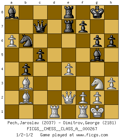 Last move : 1/2-1/2 2024 January 18 17:19:57 [Event "FICGS__CHESS__CLASS_A__000267"] [Site "FICGS"] [Date "2023.03.18"] [Round "1"] [White "Pech,Jaroslav"] [Black "Dimitrov,George"] [Result "1/2-1/2"] [WhiteElo "2037"] [BlackElo "2181"] 1.e4 e5 2.Nf3 Nc6 3.Bb5 a6 4.Ba4 Nf6 5.O-O Be7 6.Re1 b5 7.Bb3 d6 8.c3 O-O 9.h3 Bb7 10.d4 Re8 11.Nbd2 Bf8 12.a3 h6 13.Bc2 Nb8 14.b4 Nbd7 15.Bb2 c6 16.c4 exd4 17.Nxd4 c5 18.Nf5 g6 19.Ng3 Qc7 20.bxc5 dxc5 21.Qe2 Bd6 22.Qf3 Bf4 23.Rad1 Rad8 24.cxb5 axb5 25.a4 b4 26.Bb3 Re7 27.Nc4 Rde8 28.Nb6 Bg5 29.a5 Ne5 30.Qe2 Nfd7 31.Nxd7 Nxd7 32.a6 Ba8 33.Rf1 Nb6 34.Qg4 Qf4 35.Qe2 Qc7 36.Qg4 Qf4 37.Qe2 Qc7 1/2-1/2 Follow this game move after move (download)When you absolutely don't know what to do anymore, it is time to panic. (John van der Wiel) Der Freibauer hat für mich eine Seele, genau wie der Mensch, Wünsche, die unerkannt in ihm schlummern, und Befürchtungen, von deren Existenz er selbst kaum ahnt. (Aaron Nimzowitsch) Hay dos clases de hombres: aquellos que se conforman en dejarse llevar por las circunstancias y que juegan barajas y aquellos decididos a controlar las circunstancias y que juegan al Ajedrez. (Mortimer Collins) Un footballeur joue avec ses pieds, parfois avec sa tête. Un joueur d'échecs ne joue qu'avec sa tête. Et quand il ne joue plus, il meurt. (Jacob Murray) Kids, you tried your best and you failed miserably. The lesson is, never try. (Simpsons)