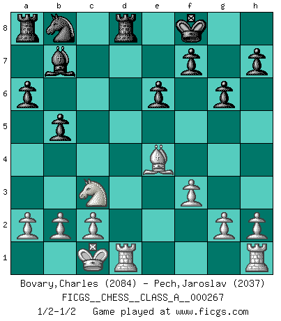 Last move : 1/2-1/2 2023 July 8 14:12:42 [Event "FICGS__CHESS__CLASS_A__000267"] [Site "FICGS"] [Date "2023.03.18"] [Round "1"] [White "Bovary,Charles"] [Black "Pech,Jaroslav"] [Result "1/2-1/2"] [WhiteElo "2084"] [BlackElo "2037"] 1.e4 e6 2.d4 d5 3.Nc3 Nf6 4.Bg5 dxe4 5.Nxe4 Be7 6.Nxf6+ Bxf6 7.Bxf6 Qxf6 8.Nf3 O-O 9.Bd3 c5 10.Qe2 cxd4 11.Qe4 g6 12.Qxd4 Qxd4 13.Nxd4 Rd8 14.Nb5 a6 15.Nc3 b5 16.O-O-O Bb7 17.f3 Kf8 18.Be4 1/2-1/2 Follow this game move after move (download)You have to have the fighting spirit. You have to force moves and take chances. (Bobby Fischer) Die unerbitterlichsten Regeln im Schach sind die Ausnahmen. (Savielly Grigorievitsch Tartakower) Preferería tener un Peón que un dedo. (Reuben Fine) Botvinnik disait en comparant les échecs à la musique: Il existe une science dont le but est l'étude de l'acoustique et des sons. Mais il y a aussi un art qui se sert de l'océan des sons : c'est la musique. De toute évidence, il en est de même pour la pensée. La logique est l'étude des lois de la réflexion et les échecs reflètent, en tant qu'art, le côté logique de la réflexion, sous la forme d'images artistiques... Extrait de Fischer - Spassky, Reykjavik 1972 par Alexander & F. Wyndham (Ed. Solar), p 37. It's not the will to win, but the will to prepare to win that makes the difference. (Bear Bryant)