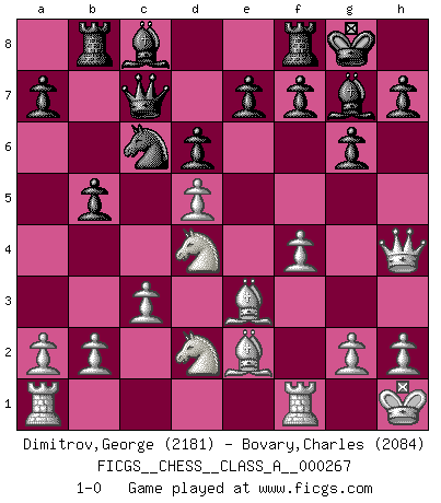 Last move : 1-0 2023 April 6 11:11:50 [Event "FICGS__CHESS__CLASS_A__000267"] [Site "FICGS"] [Date "2023.03.18"] [Round "1"] [White "Dimitrov,George"] [Black "Bovary,Charles"] [Result "1-0"] [WhiteElo "2181"] [BlackElo "2084"] 1.e4 c5 2.Nf3 Nc6 3.d4 cxd4 4.Nxd4 Qb6 5.Nb3 g6 6.Be3 Qb4+ 7.N1d2 Nf6 8.c3 Qd6 9.Be2 Bg7 10.f4 Qc7 11.O-O O-O 12.Qe1 d6 13.Qh4 b5 14.Kh1 Rb8 15.Nd4 Nd5 16.exd5 1-0 Follow this game move after move (download)Chess is as much a mystery as women. (Purdy) Wie ich sie so einen nach dem anderen nieder mähte wurde meine Überlegenheit offensichtlich. (José Raúl Capablanca) El Ajedrez es la vida. (Bobby Fischer) En blitz, le Cavalier l'emporte sur le Fou. (Vlastimil Hort) The best teachers teach from the heart, not from the book. (Author unknown)