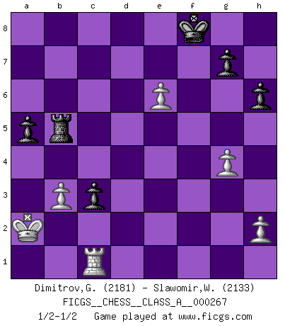 Last move : 1/2-1/2 2023 August 12 11:53:10 [Event "FICGS__CHESS__CLASS_A__000267"] [Site "FICGS"] [Date "2023.03.18"] [Round "1"] [White "Dimitrov,George"] [Black "Slawomir,Weglicki"] [Result "1/2-1/2"] [WhiteElo "2181"] [BlackElo "2133"] 1.e4 e6 2.d4 d5 3.Nc3 Nf6 4.e5 Nfd7 5.f4 c5 6.Nf3 Nc6 7.Be3 Be7 8.Qd2 a6 9.dxc5 Nxc5 10.a3 O-O 11.Qf2 Qa5 12.O-O-O Rb8 13.Kb1 Nd7 14.Nd4 Nxd4 15.Bxd4 b5 16.Na2 Qc7 17.Rd3 Bc5 18.Bxc5 Qxc5 19.Qh4 f6 20.Rc3 Qe7 21.Bd3 h6 22.Nb4 Bb7 23.g4 a5 24.Nc6 Bxc6 25.Rxc6 b4 26.a4 b3 27.Rc1 Qb4 28.cxb3 Qxb3 29.Bb5 Nb6 30.Qg3 Qb4 31.Qe1 Qxe1 32.Rxe1 fxe5 33.fxe5 Rf4 34.b3 Kf7 35.Rc7+ Kg8 36.Rc6 Kf7 37.Rc7+ Kg8 38.Re7 Rb4 39.Ka2 d4 40.Rxe6 Nd5 41.Rc6 Nc3+ 42.Rxc3 dxc3 43.e6 R8xb5 44.axb5 Kf8 45.Rc1 Rxb5 1/2-1/2 Follow this game move after move (download)White lost because he failed to remember the right continuation and had to think up the moves himself. (Siegbert Tarrasch) Nicht daß Diemer aus Opportunismus Mitglied der NSDAP geworden wäre. Er war ein Fanatiker, in allem, was er tat. (Hans Ree) La esencia del Ajedrez es pensar acerca de lo que el Ajedrez es. (David Bronstein) Le succès, c'est être capable d'aller d'échec en échec sans perdre son enthousiasme. (Winston Churchill) Difficult things take a long time, impossible things a little longer. (Author unknown)