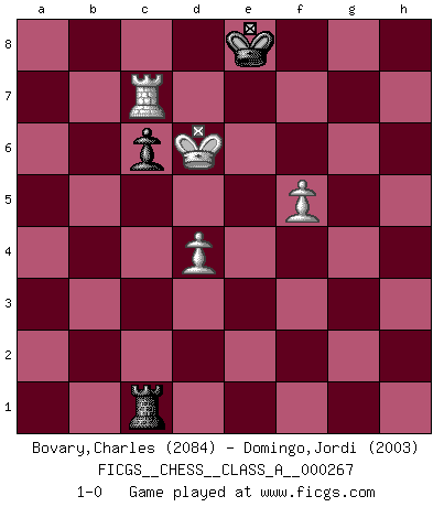 Last move : 1-0 2024 January 17 18:27:5 [Event "FICGS__CHESS__CLASS_A__000267"] [Site "FICGS"] [Date "2023.03.18"] [Round "1"] [White "Bovary,Charles"] [Black "Domingo,Jordi"] [Result "1-0"] [WhiteElo "2084"] [BlackElo "2003"] 1.e4 e5 2.Nf3 f5 3.Bc4 fxe4 4.Nxe5 d5 5.Qh5+ g6 6.Nxg6 hxg6 7.Qxg6+ Kd7 8.Bxd5 Nf6 9.Nc3 Qe7 10.d3 exd3 11.Be3 c6 12.Bb3 Bh6 13.O-O Bxe3 14.fxe3 Rf8 15.Ne4 Nxe4 16.Rxf8 Qxf8 17.Rf1 Qh8 18.Rf7+ Kd8 19.Qxe4 Nd7 20.cxd3 Qxb2 21.d4 Qc1+ 22.Rf1 Qa3 23.h4 Qd6 24.h5 Qh6 25.Bd1 Nf8 26.Rf7 Be6 27.Rxb7 Qg5 28.Qf4 Qxf4 29.exf4 Kc8 30.Rg7 Bxa2 31.h6 a5 32.h7 Nxh7 33.Rxh7 Ra6 34.Be2 Rb6 35.Ra7 Bd5 36.f5 Rb2 37.Kf1 Bxg2+ 38.Kxg2 Rxe2+ 39.Kf3 Re1 40.Kf4 Kd8 41.Rxa5 Rf1+ 42.Ke5 Ke7 43.Ra7+ Ke8 44.Rc7 Rc1 45.Kd6 1-0 Follow this game move after move (download)To avoid losing a piece, many a person has lost the game. (Savielly Tartakover) Auf Remis zu spielen ist gewissermaßen ein Verbrechen gegen das Schachspiel. (Mikhail Nekhemyevich Tal) Muchos se han convertido en Maestros de Ajedrez, nadie se ha convertido en el Maestro del Ajedrez. (Siegbert Tarrasch) Horreur, mais aussi harmonie suprême : qu'y avait-il en effet au monde en dehors des échecs ? Le brouillard, l'inconnu, le non-être... (Vladimir Nabokov) The next best thing to gambling and winning is gambling and loosing. (Nick Dandalos)