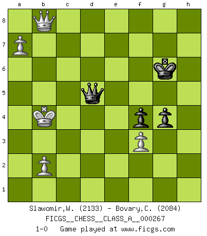 Last move : 1-0 2023 July 1 12:45:36 [Event "FICGS__CHESS__CLASS_A__000267"] [Site "FICGS"] [Date "2023.03.18"] [Round "1"] [White "Slawomir,Weglicki"] [Black "Bovary,Charles"] [Result "1-0"] [WhiteElo "2133"] [BlackElo "2084"] 1.d4 d5 2.Nf3 Nf6 3.e3 Bf5 4.c4 e6 5.Nc3 c6 6.Nh4 Bg6 7.Qb3 Qc7 8.Nxg6 hxg6 9.Bd2 Nbd7 10.cxd5 exd5 11.O-O-O a5 12.Qc2 Rxh2 13.Rxh2 Qxh2 14.a3 Be7 15.Kb1 Nb6 16.f3 Nc4 17.Bc1 b5 18.e4 Rc8 19.a4 b4 20.Ne2 Nd7 21.Nf4 g5 22.Nd3 Qc7 23.Ka2 Kf8 24.Be2 c5 25.Rh1 g6 26.dxc5 dxe4 27.Nxb4 axb4 28.Qxc4 Kg7 29.Bd2 Nxc5 30.Qxb4 Bf6 31.Bc3 Bxc3 32.Qxc3+ f6 33.Bb5 Qf7+ 34.Kb1 Qe6 35.Qa5 Qe7 36.Qb4 Qe5 37.Re1 e3 38.g4 Rc7 39.Rc1 Ne6 40.Rxc7+ Nxc7 41.Be2 f5 42.gxf5 gxf5 43.a5 Kg6 44.Qa4 Qh2 45.Qc4 Qh1+ 46.Ka2 Qh7 47.Qd4 Qe7 48.Ka1 Kh5 49.Kb1 f4 50.Qh8+ Kg6 51.Bd3+ Kf7 52.Qd4 Ne6 53.Qe4 Nd8 54.Qd5+ Qe6 55.Qxd8 e2 56.Qc7+ Kf8 57.Qb8+ Kg7 58.Qb7+ Kf6 59.Bxe2 Qxe2 60.Qc6+ Kf7 61.a6 Qd3+ 62.Ka2 Qd4 63.Ka3 g4 64.Qc7+ Kg6 65.a7 Qd3+ 66.Kb4 Qd5 67.Qb8 1-0 Follow this game move after move (download)My style is somewhere between that of Tal and Petrosian. (Reshevsky) Ich hatte Zahnschmerzen im ersten Spiel. In der zweiten Partie tat mir der Kopf weh. In der dritten war es eine Rheuma-Attacke und während der vierten fühlte ich mich nicht gut. Und in der fünften? Nun, man muss doch nicht jedes Spiel gewinnen, oder? (Savielly Grigorievitsch Tartakower) Aún el Rey más flojo huye despavorido ante la amenaza de un Jaque doble. (Aaron Nimzowitsch) Fischer est le meilleur joueur du monde et Karpov n'est qu'un joueur de bistrot. (Garry Kasparov, agé de 16 ans) Knowledge rests not upon truth alone, but upon error also. (Carl G. Jung)
