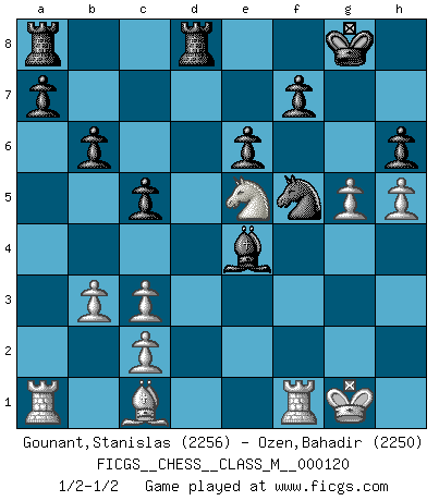 Last move : 1/2-1/2 2023 March 31 13:20:16 [Event "FICGS__CHESS__CLASS_M__000120"] [Site "FICGS"] [Date "2023.03.20"] [Round "1"] [White "Gounant,Stanislas"] [Black "Ozen,Bahadir"] [Result "1/2-1/2"] [WhiteElo "2256"] [BlackElo "2250"] 1.e4 c5 2.Nc3 d6 3.f4 g6 4.Nf3 Bg7 5.Bc4 Nc6 6.O-O e6 7.d3 Nge7 8.Qe1 O-O 9.Bb3 b6 10.Qh4 Na5 11.f5 Nxb3 12.fxg6 Nxg6 13.Qxd8 Rxd8 14.axb3 Bb7 15.h4 h6 16.h5 Ne7 17.g4 d5 18.g5 Bxc3 19.bxc3 dxe4 20.Ne5 Nf5 21.dxe4 Bxe4 1/2-1/2 Follow this game move after move (download)Everything is in a state of flux, and this includes the world of Chess. (Mikhail Botvinnik) Ich verstehe mehr vom Schach als irgendein anderer lebender Meister. (José Raúl Capablanca) El Ajedrez demanda una total concentración. (Bobby Fischer) Tout change constamment, y compris dans le monde des Echecs. (Botvinnik) Nothing is more important for teaching us to understand the concepts we have than constructing fictitious ones. (Ludwig Wittgenstein)