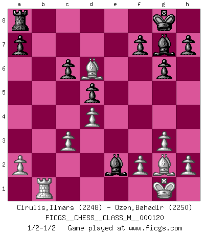 Last move : 1/2-1/2 2023 March 25 17:55:10 [Event "FICGS__CHESS__CLASS_M__000120"] [Site "FICGS"] [Date "2023.03.20"] [Round "1"] [White "Cirulis,Ilmars"] [Black "Ozen,Bahadir"] [Result "1/2-1/2"] [WhiteElo "2248"] [BlackElo "2250"] 1.Nf3 d5 2.g3 g6 3.Bg2 Bg7 4.d4 Nf6 5.c4 c6 6.O-O O-O 7.cxd5 cxd5 8.Nc3 Ne4 9.Ne5 Nxc3 10.bxc3 Nc6 11.Nxc6 bxc6 12.Qa4 Qb6 13.Ba3 Qa6 14.Qxa6 Bxa6 15.Rfb1 Rfb8 16.Bxe7 Bxe2 17.Bd6 Rxb1+ 18.Rxb1 1/2-1/2 Follow this game move after move (download)Methodical thinking is of more use in Chess than inspiration. (C. J. S. Purdy) Schach sollte überall auf der Welt Schulfach werden. Es fördert die geistige Auseinandersetzung. Es lehrt die Demut in der Niederlage. (Garry Kasparov) El Ajedrez es parte de la cultura, y si una cultura esta en decadencia, entonces también el Ajedrez declinará. (Mikhail Botvinnik) Les Echecs sont affaire de jugement sensible. Savoir quand frapper et quand esquiver. (Fischer) God is an atheist. (Unknown)