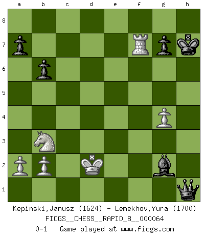 Last move : 0-1 2007 November 15 19:15:0 [Event "FICGS__CHESS__RAPID_B__000064"] [Site "FICGS"] [Date "2007.08.24"] [Round "1"] [White "Kepinski,Janusz"] [Black "Lemekhov,Yura"] [Result "0-1"] [WhiteElo "1624"] [BlackElo "1700"] 1.d4 Nf6 2.c4 e6 3.Qb3 Be7 4.Nf3 O-O 5.Nc3 b6 6.e4 Bb7 7.Bd3 Nc6 8.Be3 Nb4 9.Bb1 Ng4 10.Bd2 Nf6 11.O-O d5 12.exd5 exd5 13.cxd5 Nbxd5 14.Re1 Nxc3 15.Qxc3 c5 16.Bc2 cxd4 17.Nxd4 Rc8 18.Qd3 Bc5 19.Nb3 Bxf2+ 20.Kxf2 Rxc2 21.Qxc2 Qd5 22.Ke2 Re8+ 23.Be3 Ng4 24.Kf1 Qd6 25.Qe2 h5 26.h3 Rxe3 27.hxg4 Rxe2 28.Kxe2 h4 29.Rad1 Qg3 30.Rd8+ Kh7 31.Kd2 Qxg2+ 32.Re2 h3 33.Rd7 h2 34.Rxg2 Bxg2 35.Rxf7 h1Q 0-1 This chess game has been lost on time (started : 2007.08.24 20:11:52) Queen's pawn game Kingside Castling by player Black (move 4) Kingside Castling by player White (move 11) Promotion Queen by player Black (move 35) Player Black won this chess game. Follow this game move after move (download)For surely of all the drugs in the world, Chess must be the most permanently pleasurable. (Assiac) Gewinnen beim Schach fördert das Selbstvertrauen. Beim Sex spüre ich sowas nicht... (Garry Kasparov) Muchos se han convertido en Maestros de Ajedrez, nadie se ha convertido en el Maestro del Ajedrez. (Siegbert Tarrasch) La conception d'un plan est le processus par lequel un joueur exploite les avantages de sa position tout en s'efforçant d'en réduire au minimum les inconvénients. Afin de garantir le succès, un plan doit toujours se fonder sur un diagnostic objectif des particularités d'une position. La conception d'un plan est d'autant plus difficile que la position est équilibrée, et grandement facilitée lorsqu'il n'existe qu'un seul plan susceptible de répondre aux exigences de la position. (Harry Golombek) The question of whether computers can think is just like question of whether submarines can swim. (Edsger W. Dijkstra)