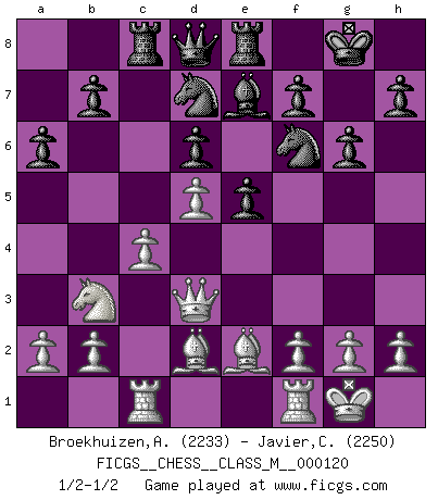 Last move : 1/2-1/2 2023 May 22 11:58:30 [Event "FICGS__CHESS__CLASS_M__000120"] [Site "FICGS"] [Date "2023.03.20"] [Round "1"] [White "Broekhuizen,A. T. S."] [Black "Javier,Christian"] [Result "1/2-1/2"] [WhiteElo "2233"] [BlackElo "2250"] 1.e4 c5 2.Nf3 d6 3.d4 cxd4 4.Nxd4 Nf6 5.Nc3 a6 6.Be2 e5 7.Nb3 Be7 8.Be3 Be6 9.Nd5 Nbd7 10.Qd3 Bxd5 11.exd5 Rc8 12.Rc1 O-O 13.O-O g6 14.Bd2 Re8 15.c4 1/2-1/2 Follow this game move after move (download)In Chess, just as in life, today's bliss may be tomorrow's poison. (Assaic) Der Bart als Geschlechtszeichen mitten im Gesicht ist obszön. Daher gefällt er den Weibern. [Zugegeben, kein Schachzitat, aber unglaublich originell] (Arthur Schopenhauer) El juego de Damas es para vagabundos. (Paul Morphy) Même un GMI sait rarement calculer sur plus de cinq coups une attaque à sacrifices. (Rudolf Spielmann) Patience, use the Force, think ! (Obi-Wan Kenobi in Star Wars ep.2)