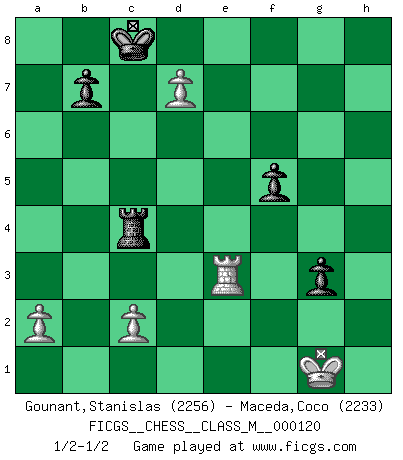 Last move : 1/2-1/2 2023 April 16 23:25:45 [Event "FICGS__CHESS__CLASS_M__000120"] [Site "FICGS"] [Date "2023.03.20"] [Round "1"] [White "Gounant,Stanislas"] [Black "Maceda,Coco"] [Result "1/2-1/2"] [WhiteElo "2256"] [BlackElo "2233"] 1.e4 e5 2.f4 exf4 3.Nf3 g5 4.Nc3 d6 5.d4 g4 6.Bxf4 gxf3 7.Qxf3 Nc6 8.Bb5 Bd7 9.Bxc6 Bxc6 10.d5 Bd7 11.e5 Qh4+ 12.g3 Qg4 13.Qe3 Ne7 14.exd6 cxd6 15.O-O f5 16.Rae1 h5 17.Bxd6 Rh7 18.Rf4 Qg6 19.Ba3 Kd8 20.d6 Nc6 21.Nb5 Kc8 22.Rc4 h4 23.Nxa7+ Rxa7 24.Qxa7 Bxd6 25.Bxd6 Qxd6 26.Qa8+ Kc7 27.Qa5+ Kb8 28.Qc5 Qg6 29.Qf8+ Kc7 30.Qa3 Qg8 31.Qa5+ Kb8 32.Qc3 Kc8 33.b4 hxg3 34.h4 Qd8 35.b5 Rxh4 36.bxc6 Qb6+ 37.Qe3 Qxe3+ 38.Rxe3 Rxc4 39.cxd7+ 1/2-1/2 Follow this game move after move (download)I still hope to kill Fischer. (Boris Spassky) Irgendwie scheint mir sonntags früh um 9 Uhr der Killerinstinkt verloren gegangen zu sein. (Alexej Shirov) El Ajedrez es en su esencia, un juego. En su forma, un arte. Y en su ejecución, una ciencia. (Baron Tassilo) Même si l'adversaire joue le coup analysé précédemment, recommencez l'analyse en voyant la nouvelle position. Première règle de Blumenfeld There are three kinds of lies: lies, damned lies and statistics. (Mark Twain)
