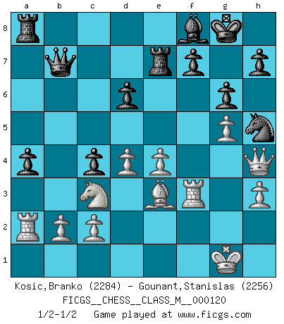 Last move : 1/2-1/2 2023 July 20 23:41:19 [Event "FICGS__CHESS__CLASS_M__000120"] [Site "FICGS"] [Date "2023.03.20"] [Round "1"] [White "Kosic,Branko"] [Black "Gounant,Stanislas"] [Result "1/2-1/2"] [WhiteElo "2284"] [BlackElo "2256"] 1.e4 c5 2.Nc3 d6 3.f4 Nc6 4.Nf3 g6 5.Bb5 Bd7 6.a4 Bg7 7.d3 a6 8.Bxc6 Bxc6 9.a5 Nf6 10.O-O O-O 11.Qe1 b5 12.axb6 Qxb6 13.h3 a5 14.f5 a4 15.Qh4 Nh5 16.Nd1 c4 17.Be3 Qb7 18.Nd4 Rfc8 19.g4 Nf6 20.g5 Nh5 21.f6 Bf8 22.Nxc6 Qxc6 23.fxe7 Bg7 24.d4 Re8 25.Nc3 Rxe7 26.Rf3 Qb7 27.Ra2 Bf8 1/2-1/2 Follow this game move after move (download)Who is your opponent tonight, tonight I am playing against the Black pieces. (Akiba Rubinstein) Zu meiner Zeit war ein 20 jähriger ein junger Spieler, heute ist er ein Veteran. (Garry Kasparov) Un jugador que trata de regresar una movida en el Ajedrez es un futuro carterista. (Richard Fenton) La vérité est comme le meilleur coup aux échecs : elle existe, mais il faut la chercher. (Arturo Perez-Reverte) For to win one hundred victories in one hundred battles is not the acme of skill. To subdue the enemy without fighting is the acme of skill. (Sun Tzu)