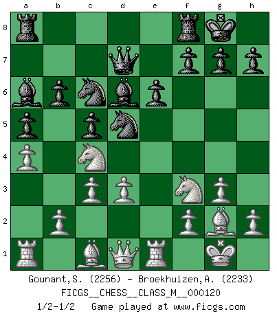 Last move : 1/2-1/2 2023 April 30 2:10:24 [Event "FICGS__CHESS__CLASS_M__000120"] [Site "FICGS"] [Date "2023.03.20"] [Round "1"] [White "Gounant,Stanislas"] [Black "Broekhuizen,A. T. S."] [Result "1/2-1/2"] [WhiteElo "2256"] [BlackElo "2233"] 1.e4 e6 2.d3 d5 3.Nd2 c5 4.Ngf3 Nc6 5.g3 Bd6 6.Bg2 Nge7 7.O-O O-O 8.Re1 b6 9.c3 a5 10.a4 Ba6 11.exd5 Nxd5 12.Nc4 Qd7 1/2-1/2 Follow this game move after move (download)If your opponent offers you a draw, try to work out why he thinks he's worse off. (Nigel Short) Wie, soll nun auch die Opposition abgeschafft werden? Ja, es tut mir leid, Ihnen diesen Schmerz nicht ersparen zu können. (Aaron Nimzowitsch) Aún el Rey más flojo huye despavorido ante la amenaza de un Jaque doble. (Aaron Nimzowitsch) J'ai vu le vaincu d'Echecs jouer des années durant dans l'espoir de la fête de la victoire. Car tu es plus riche de ce qu'elle existe si même elle n'est point pour toi. Ainsi de la perle du fond des mers. (Antoine de Saint-Exupéry) I know the human being and fish can coexist peacefully. (George W. Bush, Saginaw sept. 29, 2000)