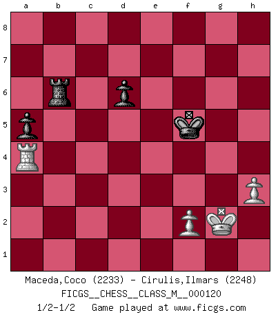 Last move : 1/2-1/2 2023 May 5 16:13:38 [Event "FICGS__CHESS__CLASS_M__000120"] [Site "FICGS"] [Date "2023.03.20"] [Round "1"] [White "Maceda,Coco"] [Black "Cirulis,Ilmars"] [Result "1/2-1/2"] [WhiteElo "2233"] [BlackElo "2248"] 1.d4 f5 2.g3 Nf6 3.Bg2 g6 4.Nf3 Bg7 5.O-O O-O 6.b3 b6 7.c4 Bb7 8.Nc3 e6 9.Bf4 d6 10.d5 e5 11.Bd2 Bc8 12.e4 f4 13.gxf4 exf4 14.e5 dxe5 15.Nxe5 Nh5 16.Re1 Nd7 17.Nc6 Qh4 18.Qf3 Kh8 19.Qh3 Qxh3 20.Bxh3 Ne5 21.Nxe5 Bxh3 22.Nf3 h6 23.Re7 Rac8 24.Rae1 Bf6 25.R7e2 g5 26.Nb5 Bg4 27.Kg2 Bd7 28.Ne5 f3+ 29.Nxf3 Bxb5 30.cxb5 Rfd8 31.h3 Rxd5 32.Re8+ Rxe8 33.Rxe8+ Kh7 34.a4 Ng7 35.Ra8 Kg6 36.Rxa7 Ne6 37.Ra8 h5 38.Be3 Be7 39.Re8 Kf7 40.Rc8 Kf6 41.Rh8 h4 42.Nh2 Kg7 43.Rb8 Rd3 44.Nf3 Kf6 45.a5 bxa5 46.b6 Bd6 47.Nxg5 Rxb3 48.Ne4+ Ke5 49.Nxd6 cxd6 50.Rh8 Nf4+ 51.Bxf4+ Kxf4 52.Rxh4+ Kg5 53.Rg4+ Kf5 54.Ra4 Rxb6 1/2-1/2 Follow this game move after move (download)The stomach is an essential part of the Chess master. (Bent Larsen) Über Karpov: Er war und ist ein Vertreter der russischen Reaktionäre. Das steckt tief in seiner Seele, wehalb ich nicht nett mit ihm umgehen kann. (Viktor Kortschnoi) La enorme capacidad mental, en la que sin ella no puede un jugador de Ajedrez existir, es demasiado requerida por el Ajedrez al grado de que nunca podrá liberar su mente de este juego. (Albert Einstein) Horreur, mais aussi harmonie suprême : qu'y avait-il en effet au monde en dehors des échecs ? Le brouillard, l'inconnu, le non-être... (Vladimir Nabokov) There's no money in correspondence chess. (John Knudsen)