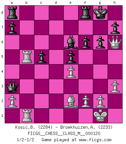 Last move : 1/2-1/2 2023 August 19 20:20:13 [Event "FICGS__CHESS__CLASS_M__000120"] [Site "FICGS"] [Date "2023.03.20"] [Round "1"] [White "Kosic,Branko"] [Black "Broekhuizen,A. T. S."] [Result "1/2-1/2"] [WhiteElo "2284"] [BlackElo "2233"] 1.e4 c5 2.Nf3 d6 3.d4 cxd4 4.Qxd4 Nf6 5.Be2 g6 6.O-O Bg7 7.Rd1 O-O 8.h3 Nc6 9.Qe3 Qc7 10.c4 Nd7 11.Nc3 Qb6 12.Qg5 Bxc3 13.bxc3 Nc5 14.Be3 Qa5 15.Bxc5 Qxc5 16.Rd5 Qa3 17.c5 Be6 18.cxd6 exd6 19.Rb5 Ne5 20.Nxe5 dxe5 21.c4 f6 22.Qh6 b6 23.c5 bxc5 24.Rab1 1/2-1/2 Follow this game move after move (download)Chess is a beautiful mistress. (Bent Larsen) Ein bischen Romantik kann weder im Schach noch in der Liebe schaden. Also versuche ich mich ab und zu daran zu erinnern. (Nigel Short) No es una movida, aún la mejor movida que tu debas buscar, sino un plan comprensible. (Eugene Znosko-Borovsky) Si je n'étais pas joueur d'échecs, je serais le meilleur dans quelque chose d'autre. (Anatoli Karpov) The Internet is so big, so powerful and pointless that for some people it is a complete substitute for life. (Andrew Brown)