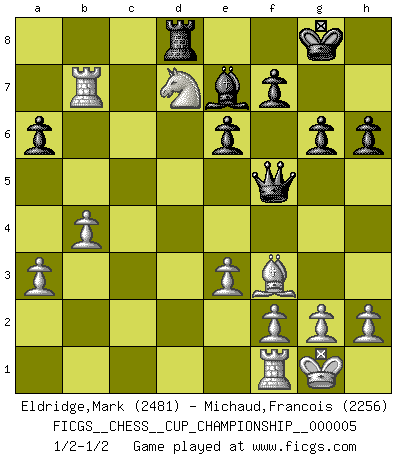 Last move : 1/2-1/2 2023 May 7 17:39:32 [Event "FICGS__CHESS__CUP_CHAMPIONSHIP__000005"] [Site "FICGS"] [Date "2023.03.23"] [Round "1"] [White "Eldridge,Mark"] [Black "Michaud,Francois"] [Result "1/2-1/2"] [WhiteElo "2481"] [BlackElo "2256"] 1.Nf3 Nf6 2.d4 d5 3.c4 e6 4.Nc3 Bb4 5.Bg5 h6 6.Bxf6 Qxf6 7.e3 O-O 8.Rc1 dxc4 9.Bxc4 c5 10.O-O cxd4 11.Nxd4 Bd7 12.Ne4 Qe5 13.Qc2 Nc6 14.Nf3 Qc7 15.a3 Be7 16.Be2 Rac8 17.b4 Qb8 18.Nc5 Ne5 19.Nxe5 Qxe5 20.Nxd7 Rxc2 21.Rxc2 Qf5 22.Rc7 Rd8 23.Rxb7 a6 24.Bf3 g6 1/2-1/2 Follow this game move after move (download)It began to feel as though you were playing against Chess itself. - On playing against Robert Fischer. (Walter Shipman) Ich habe die Schachforschung dermaßen betrieben, dass sie auf eine wissenschaftliche Basis gestellt wurde. (Mikhail Moiseyevich Botvinik) El Ajedrez no es una pizca de inferior al violín, y tenemos un gran número de violinistas profesionales. (Mikhail Botvinnik) Le moment que je préfère le plus dans une rencontre, c'est celui où je sens que la personnalité de l'adversaire se brise. (Robert Fischer) Knowledge will give you power, but character respect. (Bruce Lee)