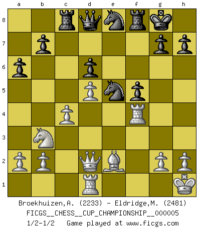 Last move : 1/2-1/2 2023 May 19 21:45:48 [Event "FICGS__CHESS__CUP_CHAMPIONSHIP__000005"] [Site "FICGS"] [Date "2023.03.23"] [Round "1"] [White "Broekhuizen,A. T. S."] [Black "Eldridge,Mark"] [Result "1/2-1/2"] [WhiteElo "2233"] [BlackElo "2481"] 1.e4 c5 2.Nf3 d6 3.d4 cxd4 4.Nxd4 Nf6 5.Nc3 a6 6.Be2 e5 7.Nb3 Be7 8.Be3 Be6 9.Nd5 Nbd7 10.Qd3 O-O 11.O-O Bxd5 12.exd5 Ne8 13.Rad1 Rc8 14.c4 f5 15.Kh1 Bg5 16.f4 exf4 17.Bxf4 Bxf4 18.Rxf4 Ne5 19.Qd2 1/2-1/2 Follow this game move after move (download)Modern Chess is too much concerned with things like Pawn structure. Forget it, Checkmate ends the game. (Nigel Short) Ein Kibitz ist einer, der deinem Gegner gute Ratschläge gibt. (Andrew Soltis) Una buena ofensiva y una buena defensa, comienzan ambas con un buen desarrollo. (Bruce A. Moon) Le génie consiste à savoir transgresser les règles au moment opportun. (Teichmann) The arrogant army will lose certainly the battle. (Chinese proverb)