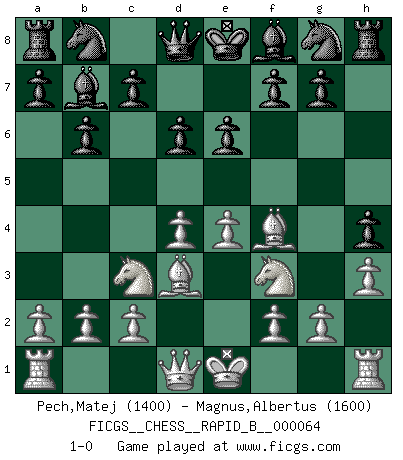 Last move : 1-0 2007 October 24 14:1:58 [Event "FICGS__CHESS__RAPID_B__000064"] [Site "FICGS"] [Date "2007.08.24"] [Round "1"] [White "Pech,Matej"] [Black "Magnus,Albertus"] [Result "1-0"] [WhiteElo "1400"] [BlackElo "1600"] 1.d4 h5 2.e4 h4 3.Nc3 e6 4.h3 b6 5.Nf3 Bb7 6.Bd3 d6 7.Bf4 1-0 This chess game has been lost on time (started : 2007.08.24 20:11:52) Queen's pawn Player White won this chess game. Follow this game move after move (download)With or without the title, Bobby Fischer was unquestionably the greatest player of his time. (Burt Hochberg) Man braucht nicht immer den besten Zug zu spielen: Ein Zug muß aktiv, unternehmungslustig, korrekt und schön sein. (David Bronstein) ¿Esta Bobby Fischer algo cuerdo?. (Salo Flohr) Karpov est une pièce de musée. (Garry Kasparov) Life is like internet, nothing interesting, but noone want to leave it. (Ilmars Cirulis)
