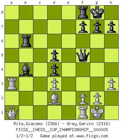 Last move : 1/2-1/2 2023 May 16 12:19:51 [Event "FICGS__CHESS__CUP_CHAMPIONSHIP__000005"] [Site "FICGS"] [Date "2023.03.23"] [Round "1"] [White "Rita,Giacomo"] [Black "Gray,Garvin"] [Result "1/2-1/2"] [WhiteElo "2366"] [BlackElo "2316"] 1.e4 e5 2.Nf3 Nc6 3.Bb5 a6 4.Ba4 Nf6 5.O-O b5 6.Bb3 Bb7 7.d3 Be7 8.c4 O-O 9.Nc3 bxc4 10.Bxc4 d6 11.a3 Nd4 12.Nxd4 exd4 13.Nd5 Nxd5 14.exd5 a5 15.h3 Bg5 16.Qg4 Bf6 17.Bd2 Bc8 18.Qd1 Bd7 19.a4 c5 20.dxc6 Bxc6 21.Bb5 Bxb5 22.axb5 Qd7 23.b6 a4 24.b3 a3 25.Ra2 Qf5 26.Qc2 Rac8 27.Qb1 Rb8 28.Rxa3 Rxb6 29.b4 d5 30.Qd1 Be7 31.Qa1 Bxb4 1/2-1/2 Follow this game move after move (download)If I win a tournament, I win it by myself. I do the playing. Nobody helps me. (Bobby Fischer) Wenn ich einen Club besuche, sind die Spieler stumm vor Staunen. (José Raúl Capablanca) Nos gusta pensar. (Gary Kasparov) On a dit que l'homme se distingue de l'animal par le fait qu'il achète plus de livres qu'il ne peut en lire. Je voudrais suggérer qu'inclure à la liste des livres quelques livres d'échecs rendrait la distinction manifeste. (Edward Lasker) It's only after you lost everything, Tyler says, that you're free to do anything. (Chuck Palahniuk, Fight Club)