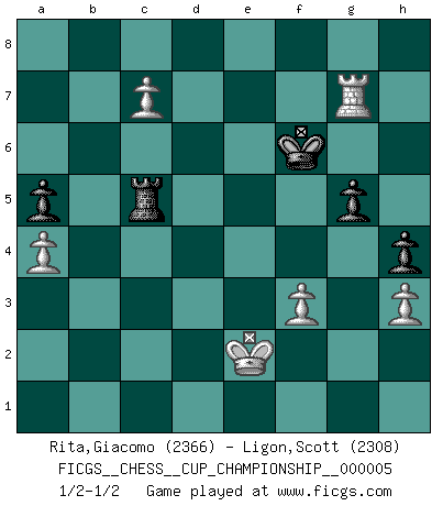Last move : 1/2-1/2 2023 April 24 1:47:49 [Event "FICGS__CHESS__CUP_CHAMPIONSHIP__000005"] [Site "FICGS"] [Date "2023.03.23"] [Round "1"] [White "Rita,Giacomo"] [Black "Ligon,Scott"] [Result "1/2-1/2"] [WhiteElo "2366"] [BlackElo "2308"] 1.e4 Nf6 2.e5 Nd5 3.c4 Nb6 4.d4 d6 5.f4 dxe5 6.fxe5 Nc6 7.Be3 Bf5 8.Nc3 e6 9.Be2 Be7 10.Nf3 f6 11.O-O O-O 12.exf6 Bxf6 13.Qd2 h6 14.Rad1 Qe8 15.Bf4 Qe7 16.h3 e5 17.Nxe5 Nxe5 18.dxe5 Bxe5 19.Nd5 Qc5+ 20.Be3 Qd6 21.b4 Nxd5 22.Bc5 Bf4 23.Bxd6 Bxd2 24.Rxd2 cxd6 25.Rxd5 Rae8 26.Bf3 Be4 27.Rxd6 Bxf3 28.Rxf3 Rxf3 29.gxf3 Re2 30.a3 b6 31.c5 bxc5 32.bxc5 Kf7 33.c6 a5 34.a4 Rc2 35.Rd7+ Kf6 36.c7 g5 37.Kf1 h5 38.Ke1 Ke6 39.Rg7 Kf6 40.Kd1 Rc5 41.Rh7 h4 42.Ke2 Ke5 43.Rf7 Ke6 44.Rg7 Kf6 45.Rd7 Ke6 46.Rg7 Kf6 1/2-1/2 Follow this game move after move (download)White lost because he failed to remember the right continuation and had to think up the moves himself. (Siegbert Tarrasch) Nicht daß Diemer aus Opportunismus Mitglied der NSDAP geworden wäre. Er war ein Fanatiker, in allem, was er tat. (Hans Ree) En la vida, como en el Ajedrez, los Peones propios obstruyen nuestro camino. La gran fortuna de un hombre, su comodidad, placer, hijos, libros, que deberían ayudarle a ganar, con mucha frecuencia lo ponen en Jaque Mate. (Charles Buxton) Echiquier : carré parfait, comme la Jérusalem nouvelle décrite par l'auteur de l'Apocalypse, huit cases sur huit, exaltation du chiffre 4, symbole du cosmos aux quatre horizons... où le noir et le blanc, l'ombre et la lumière, le mal et le bien s'entremêlent et se conjuguent. (Robert Couffignal, Le Gambit du poète) Drag your thoughts away from your troubles... by the ears, by the heels, or any other way you can manage it. (Mark Twain)