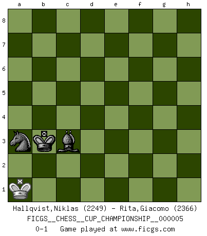 Last move : 0-1 2023 August 21 12:29:41 [Event "FICGS__CHESS__CUP_CHAMPIONSHIP__000005"] [Site "FICGS"] [Date "2023.03.23"] [Round "1"] [White "Hallqvist,Niklas"] [Black "Rita,Giacomo"] [Result "0-1"] [WhiteElo "2249"] [BlackElo "2366"] 1.d4 Nf6 2.c4 e6 3.g3 d5 4.Bg2 Bb4+ 5.Bd2 Be7 6.Nf3 O-O 7.O-O c6 8.Nc3 dxc4 9.Ne5 Qxd4 10.Bf4 Qc5 11.Rc1 Rd8 12.Qc2 g5 13.Na4 Qb5 14.Nc3 Qa5 15.Nxc4 Qb4 16.Bxb8 Qxc4 17.Be5 Ng4 18.Bc7 Rd7 19.h3 Nh6 20.Ba5 b6 21.b3 Qc5 22.b4 Qf5 23.Qxf5 Nxf5 24.Bxc6 Rb8 25.Bxd7 Bxd7 26.Rfd1 Be8 27.Ne4 Ba4 28.Rd3 bxa5 29.bxa5 a6 30.g4 Nh4 31.Rdc3 Kg7 32.Rc7 Ba3 33.Rf1 Ng6 34.Nxg5 Ne7 35.Rc3 Bd6 36.Rf3 Be8 37.Rd1 Bc7 38.Rc3 Bxa5 39.Ra3 Bb6 40.Ne4 Bb5 41.e3 h5 42.g5 Rc8 43.Rc3 Rh8 44.Rdc1 Rd8 45.Ra3 Nf5 46.Nc3 Rc8 47.Rb1 Bd8 48.Nxb5 axb5 49.Rab3 Nd6 50.Rb4 Ra8 51.Rd4 Be7 52.Rb2 Nf5 53.Re4 Bxg5 54.Rxb5 Rxa2 55.R5b4 Rd2 56.Rec4 Rd1+ 57.Kh2 Ne7 58.Rc5 Kh6 59.R4b5 Bf6 60.Kg2 Rd2 61.Kf1 Nd5 62.Rb7 Kg6 63.Rc4 Ra2 64.Rb8 Kg7 65.Rb7 Bg5 66.Kg1 Be7 67.Re4 Ra6 68.Re5 Bf6 69.Re4 Kg6 70.Rb3 Bc3 71.Rc4 Bg7 72.Kg2 f5 73.Kf3 Bf6 74.Rc2 Bg5 75.Rcb2 Kf6 76.Rb8 f4 77.e4 Ne7 78.R8b6 Ra3+ 79.R2b3 Rxb3+ 80.Rxb3 Nc6 81.Kg2 Nd4 82.Ra3 Bh4 83.f3 Nc2 84.Rc3 Ne1+ 85.Kf1 Bg3 86.Ke2 Kg5 87.Rc6 Kh4 88.Rxe6 Kxh3 89.Rh6 Kg2 90.Rxh5 Nxf3 91.e5 Nxe5 92.Rf5 f3+ 93.Rxf3 Nxf3 94.Ke3 Ne5 95.Ke4 Kf2 96.Kd4 Kf3 97.Kd5 Ke3 98.Kc5 Ke4 99.Kd6 Kd4 100.Kc7 Kc5 101.Kb7 Nc4 102.Ka7 Kc6 103.Ka6 Be5 104.Ka7 Nb6 105.Ka6 Bb8 106.Ka5 Nd5 107.Ka4 Be5 108.Kb3 Ne3 109.Kb4 Kb6 110.Ka4 Bc3 111.Kb3 Bd2 112.Ka4 Kc5 113.Kb3 Kb5 114.Ka3 Ba5 115.Kb3 Bb4 116.Ka2 Ka4 117.Kb2 Bd2 118.Ka1 Ka3 119.Kb1 Kb3 120.Ka1 Nc4 121.Kb1 Na3+ 122.Ka1 Bc3+ 0-1 Follow this game move after move (download)When I have White, I win because I am white; When I have Black, I win because I am Bogolyubov. (Bogolyubov) Schach ist Kampf, hauptsächlich jedoch gegen die eigenen Fehler. (Savielly Grigorievitsch Tartakower) Los Peones son el alma de una partida de Ajedrez. (Francois Andre Danican Philidor) Vouloir jouer aux échecs contre soi-même est aussi paradoxal que vouloir marcher sur son ombre. (Stefan Zweig) Statistics can be made to prove anything - even the truth. (Author unknown)