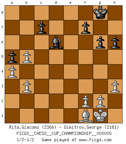 Last move : 1/2-1/2 2023 May 8 11:48:39 [Event "FICGS__CHESS__CUP_CHAMPIONSHIP__000005"] [Site "FICGS"] [Date "2023.03.23"] [Round "1"] [White "Rita,Giacomo"] [Black "Dimitrov,George"] [Result "1/2-1/2"] [WhiteElo "2366"] [BlackElo "2181"] 1.e4 e5 2.Nf3 Nc6 3.Bb5 a6 4.Ba4 Nf6 5.O-O Be7 6.Re1 b5 7.Bb3 d6 8.c3 O-O 9.h3 Bb7 10.d4 Re8 11.Ng5 Rf8 12.Nf3 Re8 13.Nbd2 Bf8 14.a3 h6 15.Bc2 Nb8 16.b3 Nbd7 17.Bb2 g6 18.Bd3 Bg7 19.dxe5 Nxe5 20.Nxe5 dxe5 21.Qc2 Qd6 22.Rad1 Rad8 23.Nf3 Qc6 24.Rd2 Nd7 25.c4 Nc5 26.Bf1 Nxe4 27.Rxd8 Rxd8 28.Nxe5 Qf6 29.Rxe4 Bxe4 30.Qxe4 Rd2 31.Bd4 Rxd4 32.Qxd4 Qxe5 33.Qxe5 Bxe5 34.cxb5 a5 35.a4 Bd6 1/2-1/2 Follow this game move after move (download)The defensive power of a pinned piece is only imaginary. (Aaron Nimzovich) Wenn man heute mit 14 Jahren noch kein GM ist, kann man es vergessen. (Viswanathan Anand) A través de las casillas del tablero, los Indios explican el movimiento del tiempo y la edad, las influencias mas altas que controlan el mundo y los lazos que vinculan al Ajedrez con el alma humana. (Al-Masudi) Les Echecs, c'est l'art de la guerre sans les charniers, c'est la résurrection des morts tombés au champ d'honneur, l'espoir perpétuel, la suprématie de l'intelligence sur la force, la culture de l'esprit. (F. Szpiner) Lamb in skin of tiger, still fears the wolf. (Chinese proverb)