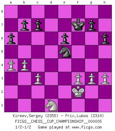 Last move : 1/2-1/2 2023 May 15 18:27:29 [Event "FICGS__CHESS__CUP_CHAMPIONSHIP__000005"] [Site "FICGS"] [Date "2023.03.23"] [Round "1"] [White "Kireev,Sergey"] [Black "Fric,Lubos"] [Result "1/2-1/2"] [WhiteElo "2355"] [BlackElo "2314"] 1.e4 e5 2.Nf3 Nc6 3.Bc4 Nf6 4.d3 a6 5.O-O Bc5 6.c3 d6 7.Re1 O-O 8.h3 Ba7 9.a4 h6 10.Nbd2 Re8 11.b4 Be6 12.Qc2 Qd7 13.Bxe6 Qxe6 14.Nf1 d5 15.Be3 Bxe3 16.Nxe3 Ne7 17.exd5 Nexd5 18.Nc4 Nd7 19.Nfxe5 Nxe5 20.Nxe5 Qf5 21.Ng4 Nf4 22.Re3 Rxe3 23.Nxe3 Qg6 24.Kh2 Nxd3 25.Rd1 Rd8 26.Qe2 Qe4 27.g3 Rd7 28.f3 Qg6 29.Nc4 Qe6 30.Qxe6 fxe6 31.Nb2 Ne5 32.Kg2 Kf7 33.Kf2 Rxd1 34.Nxd1 1/2-1/2 Follow this game move after move (download)No price is too great for the scalp of the enemy King. (Koblentz) Fallen sollten polizeilich verboten werden. (Savielly Grigorievitsch Tartakower) Juega la Apertura como un libro, el Juego Medio como un mago y los Finales como una máquina. (Spielmann) La vérité est comme le meilleur coup aux échecs : elle existe, mais il faut la chercher. (Arturo Perez-Reverte) The good fighters of old first put themselves beyond the possibility of defeat, and then waited for an opportunity of defeating the enemy. (Sun Tzu)