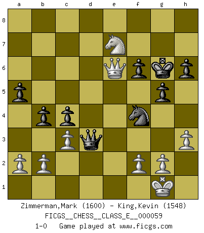 Last move : 1-0 2007 October 16 21:51:28 [Event "FICGS__CHESS__CLASS_E__000059"] [Site "FICGS"] [Date "2007.08.25"] [Round "1"] [White "Zimmerman,Mark"] [Black "King,Kevin"] [Result "1-0"] [WhiteElo "1600"] [BlackElo "1548"] 1.Nf3 Nf6 2.Nc3 g6 3.e4 d6 4.d4 Bg7 5.Bc4 O-O 6.h3 c6 7.Be3 b5 8.Bb3 a6 9.e5 dxe5 10.Nxe5 Bb7 11.O-O Nbd7 12.Nxd7 Qxd7 13.Ne2 Nd5 14.Bg5 h6 15.Bh4 e5 16.c3 exd4 17.Nxd4 c5 18.Nf3 c4 19.Bc2 Qc6 20.Re1 Rfe8 21.Qd2 Rxe1+ 22.Rxe1 g5 23.Bg3 Re8 24.Rxe8+ Qxe8 25.Qe1 Qa8 26.Be4 Nf6 27.Bxb7 Qxb7 28.Be5 Qe4 29.Qd1 Nd5 30.Bxg7 Kxg7 31.Kf1 f6 32.Qe1 Qd3+ 33.Kg1 a5 34.Nd4 b4 35.Qe6 Nf4 36.Nf5+ Kg6 37.Ne7+ 1-0 Reti Opening Kingside Castling by player Black (move 5) Kingside Castling by player White (move 11) Player White won this chess game. Follow this game move after move (download)Personally, I rather look forward to a computer program winning the world Chess Championship. Humanity needs a lesson in humility. (Richard Dawkings) Es gibt Leute, die glauben, alles wäre vernünftig, was man mit einem ernsthaften Gesicht tut. (Georg Christoph Lichtenberg) El Ajedrez es una manera fabulosa para que los niños aprendan a autovalorarse y a autoestimarse. (Saudin Robovic) Même un GMI sait rarement calculer sur plus de cinq coups une attaque à sacrifices. (Rudolf Spielmann) Patience, use the Force, think ! (Obi-Wan Kenobi in Star Wars ep.2)